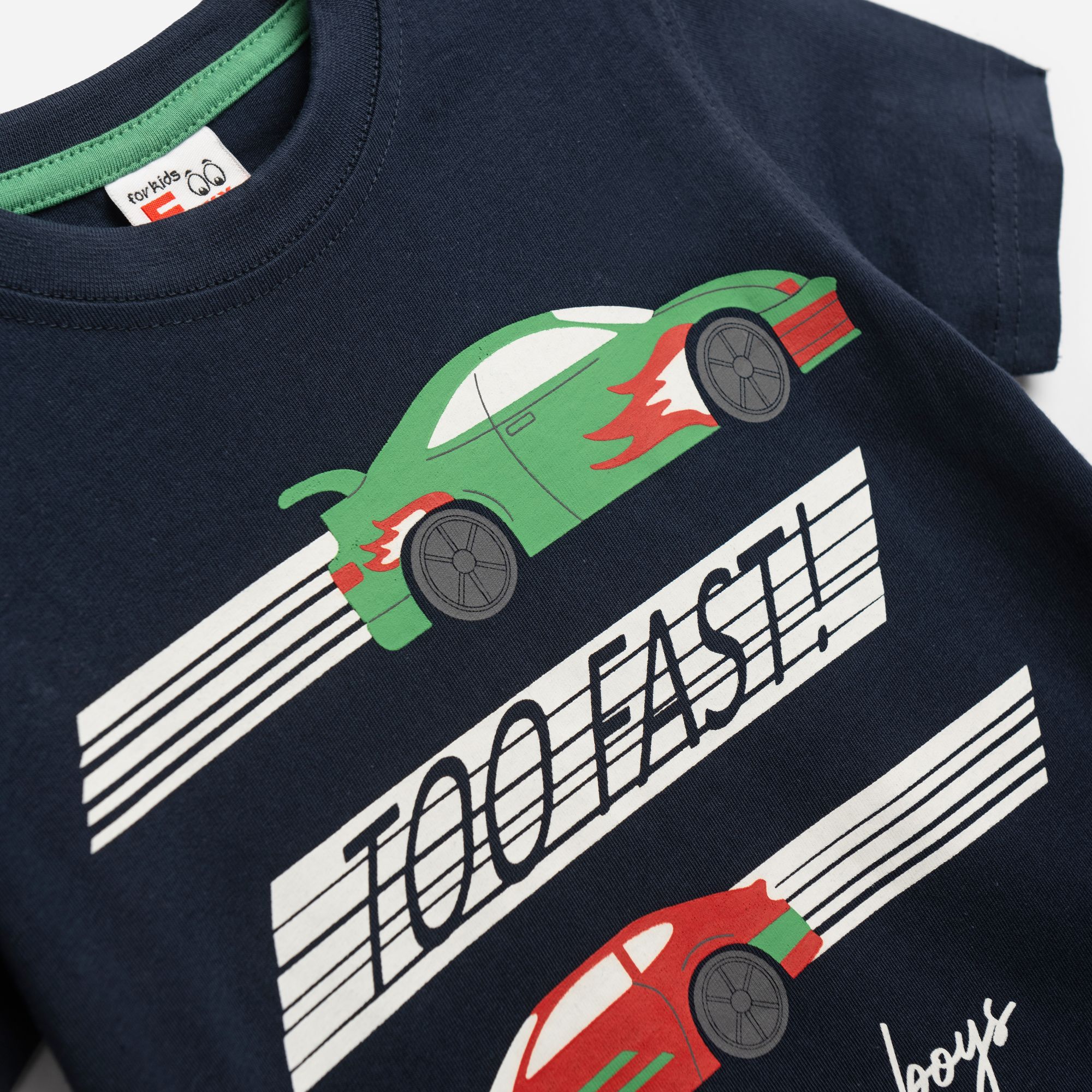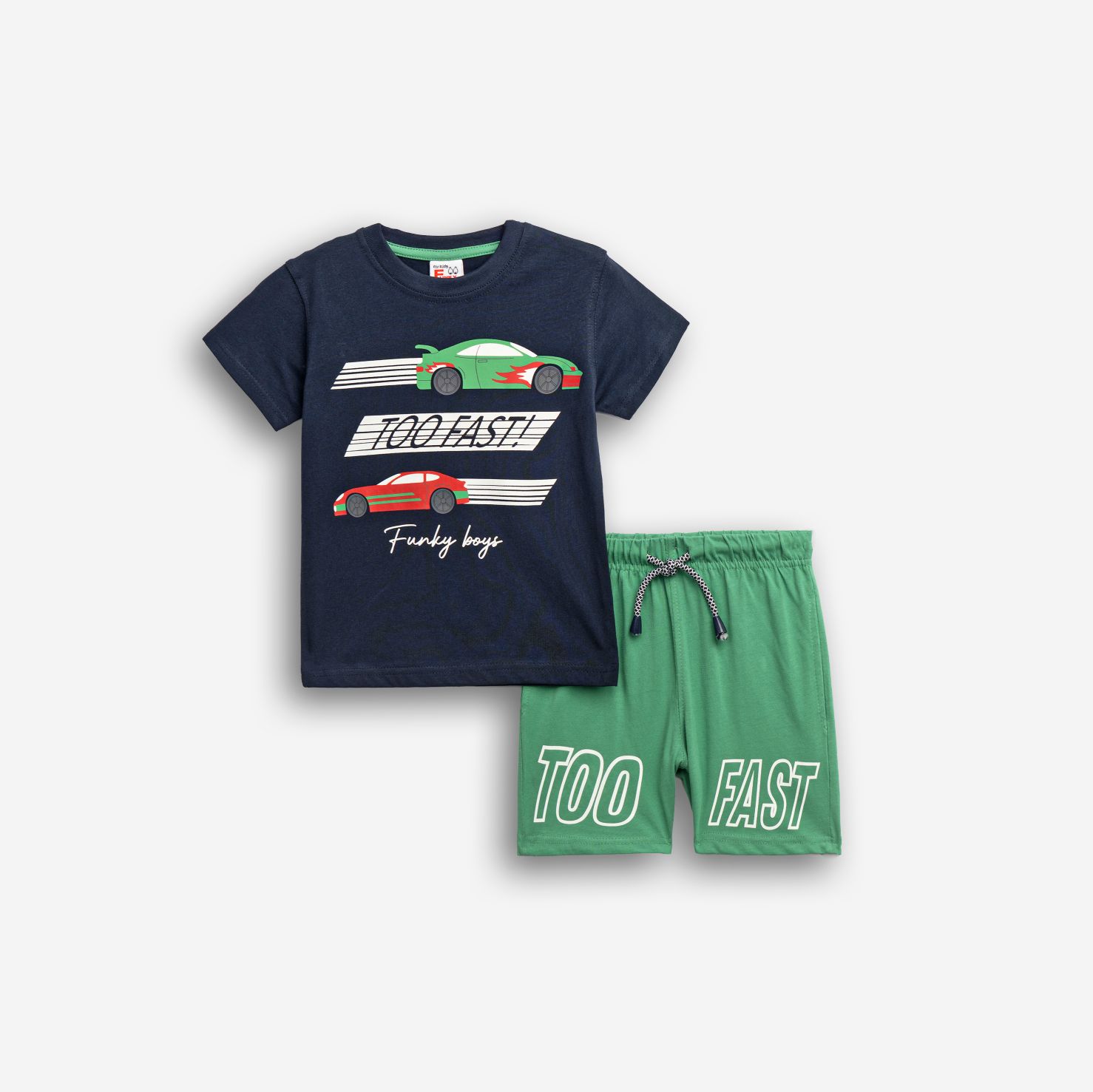 Σετ μπλούζα μακό με τύπωμα (too fast) και βερμούδα πάνω από το γόνατο με τύπωμα σε χρώμα μπλέ/leprechaun για αγόρι 1-6 ετών