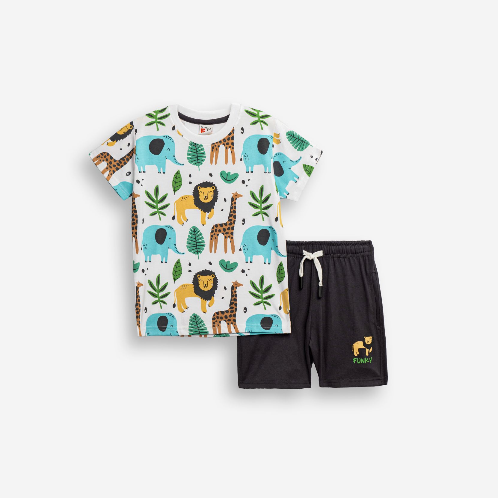 Σετ μπλούζα μακό με τύπωμα (ζωάκια) allover και βερμούδα με τύπωμα πάνω από το γόνατο σε χρώμα λευκό/ανθρακί για αγόρι 1-6 ετών