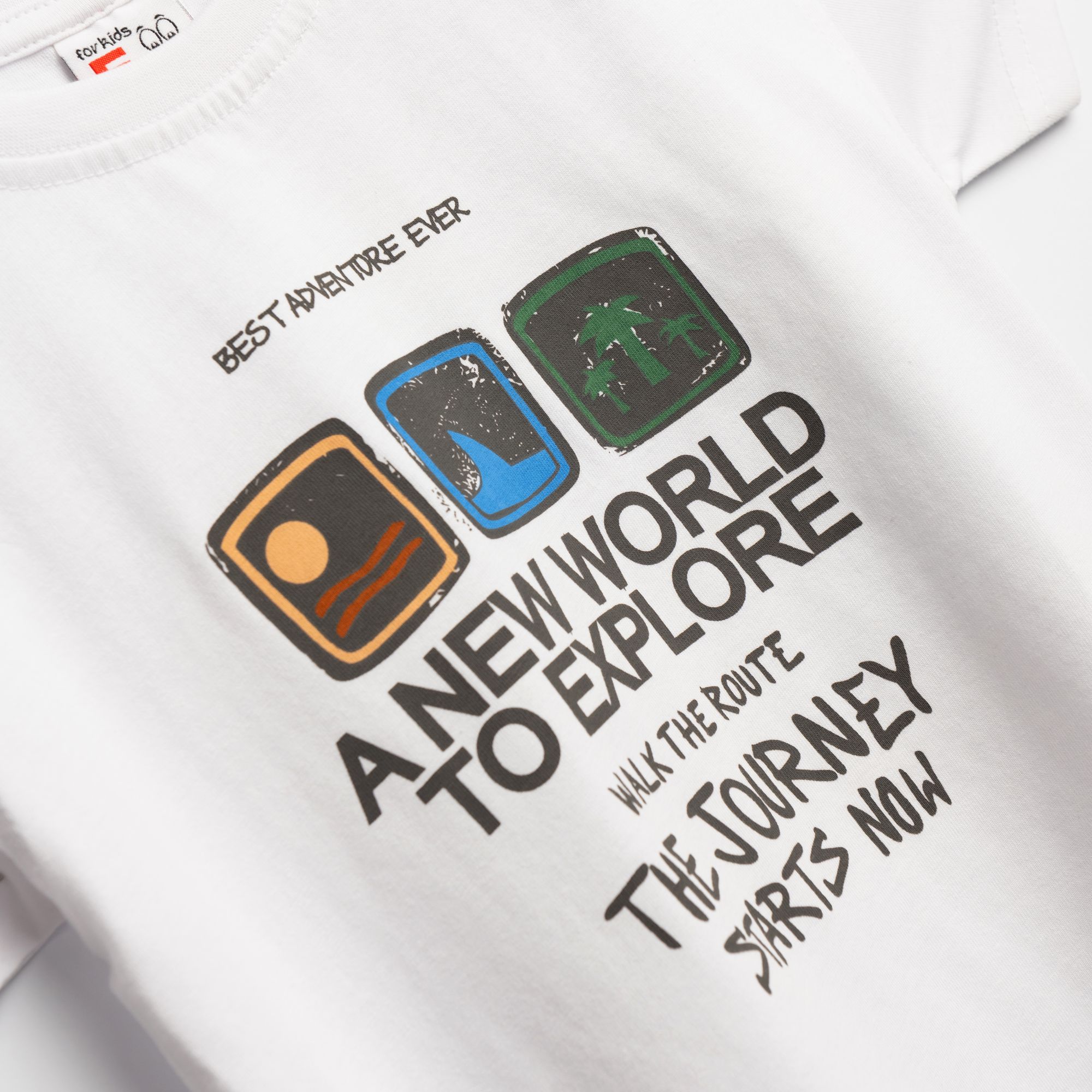 Σετ μπλούζα μακό με τύπωμα (new world to explore) και βερμούδα με τσέπες πάνω από το γόνατο σε χρώμα λευκό/garden για αγόρι 1-6 ετών