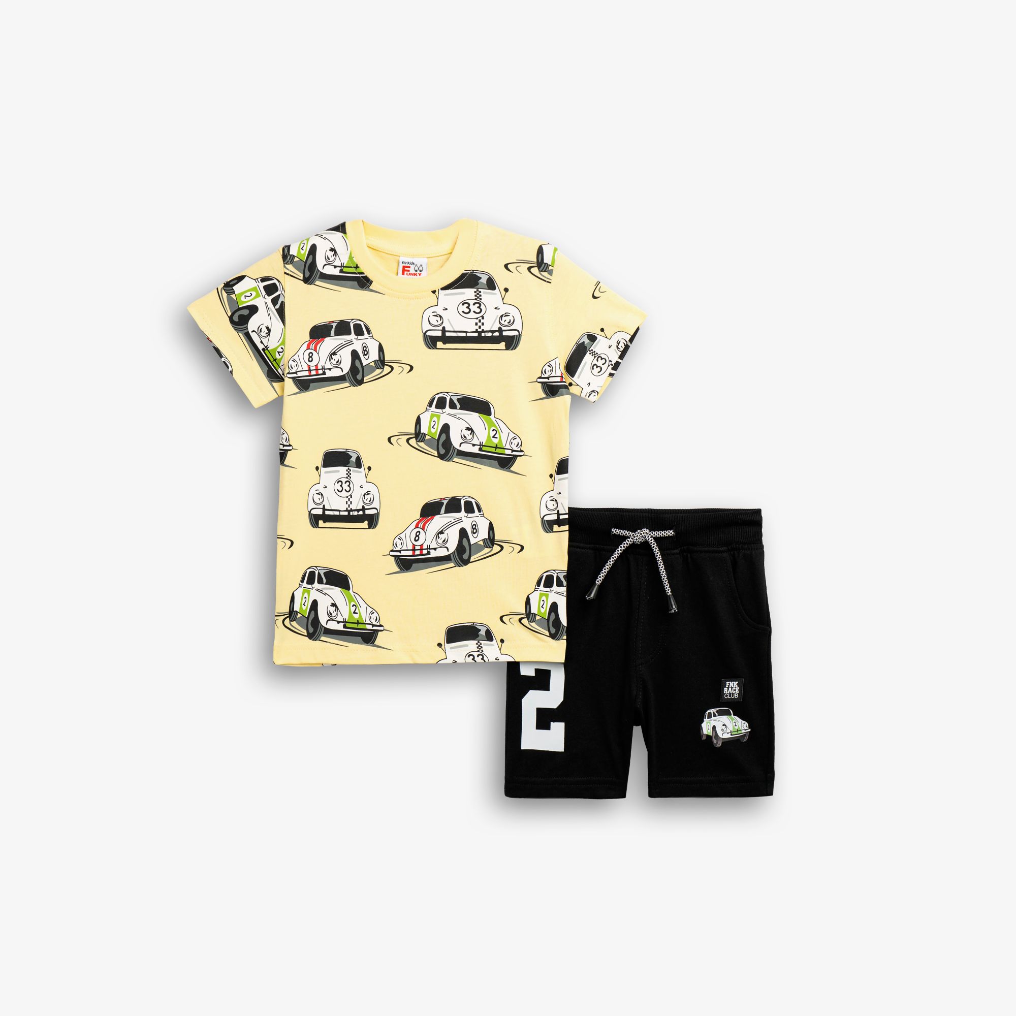 Σετ μπλούζα με τύπωμα (race cars) allover και βερμούδα φούτερ πάνω από το γόνατο με τύπωμα σε χρώμα ανοιχτή λεμονάδα/μαύρο για αγόρι 1-6 ετών