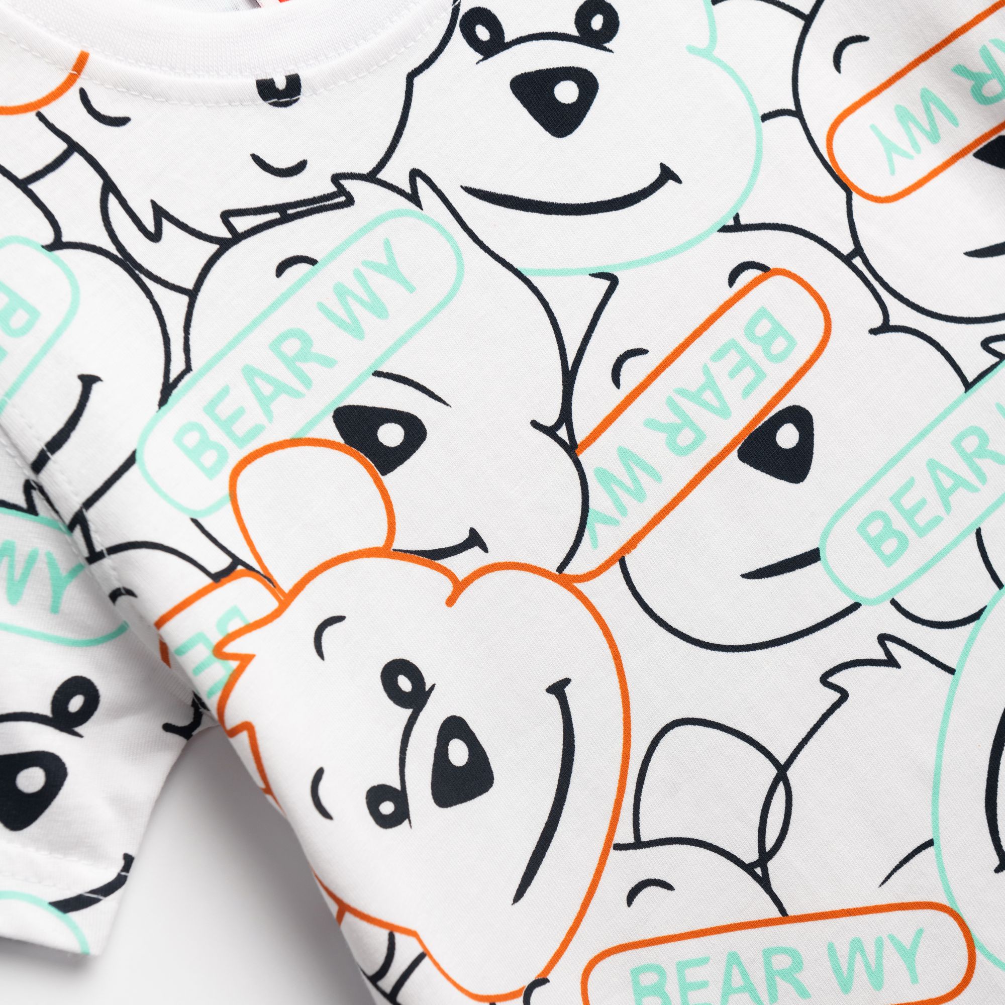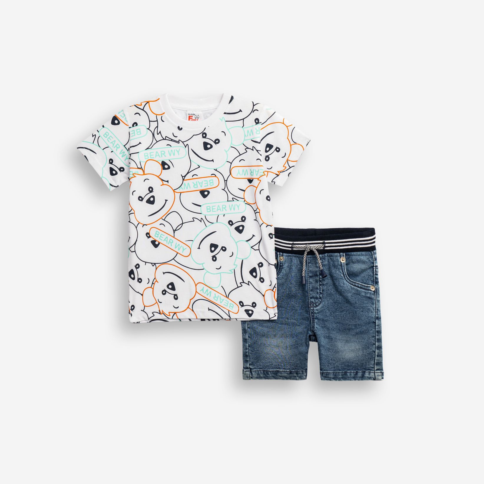 Σετ μπλούζα με τύπωμα (αρκουδάκι) allover και βερμούδα φούτερ τζίν πάνω από το γόνατο σε χρώμα λευκό/μπλέ τζίν για αγόρι 1-6 ετών