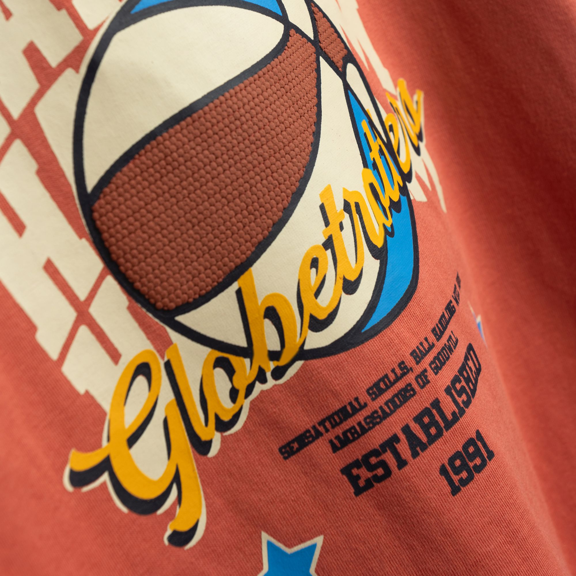 Σετ μπλούζα με τύπωμα (μπάλα μπάσκετ) και βερμούδα φούτερ τζίν πάνω από το γόνατο σε χρώμα τερακότα/μπλέ τζίν για αγόρι 1-6 ετών