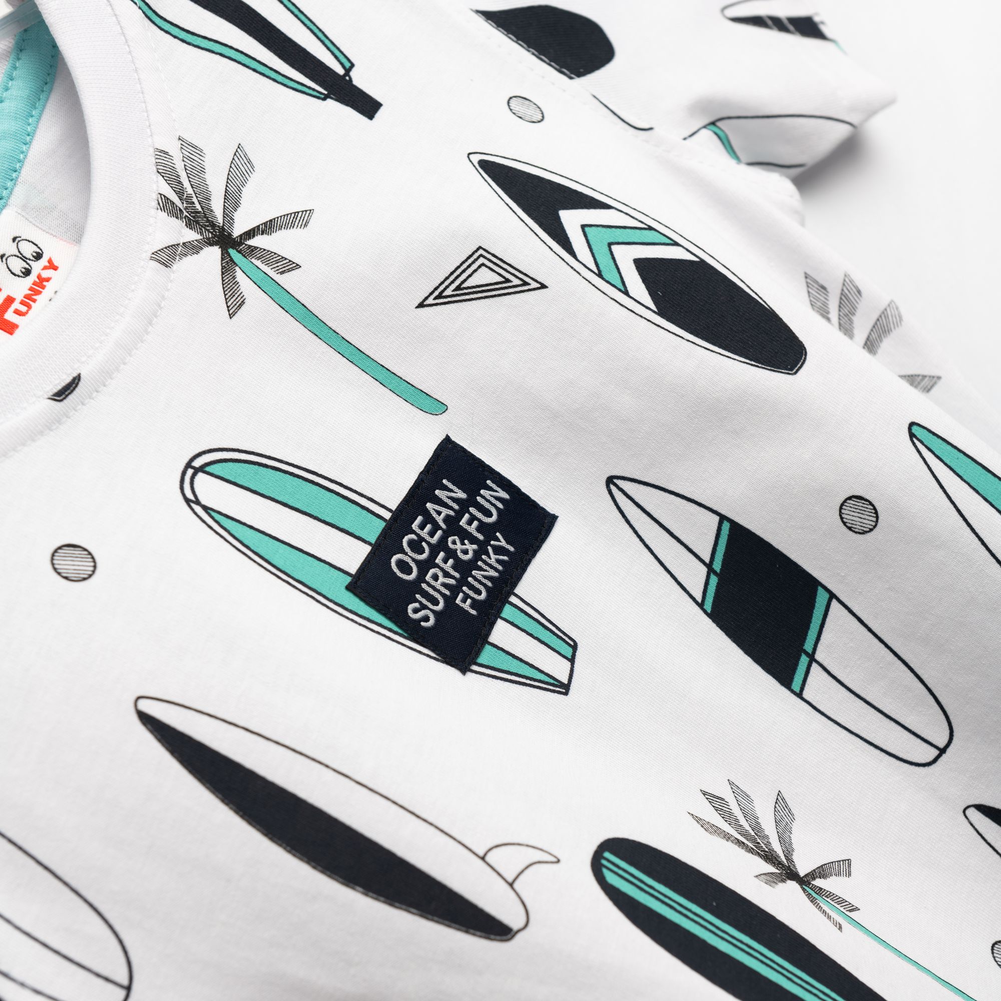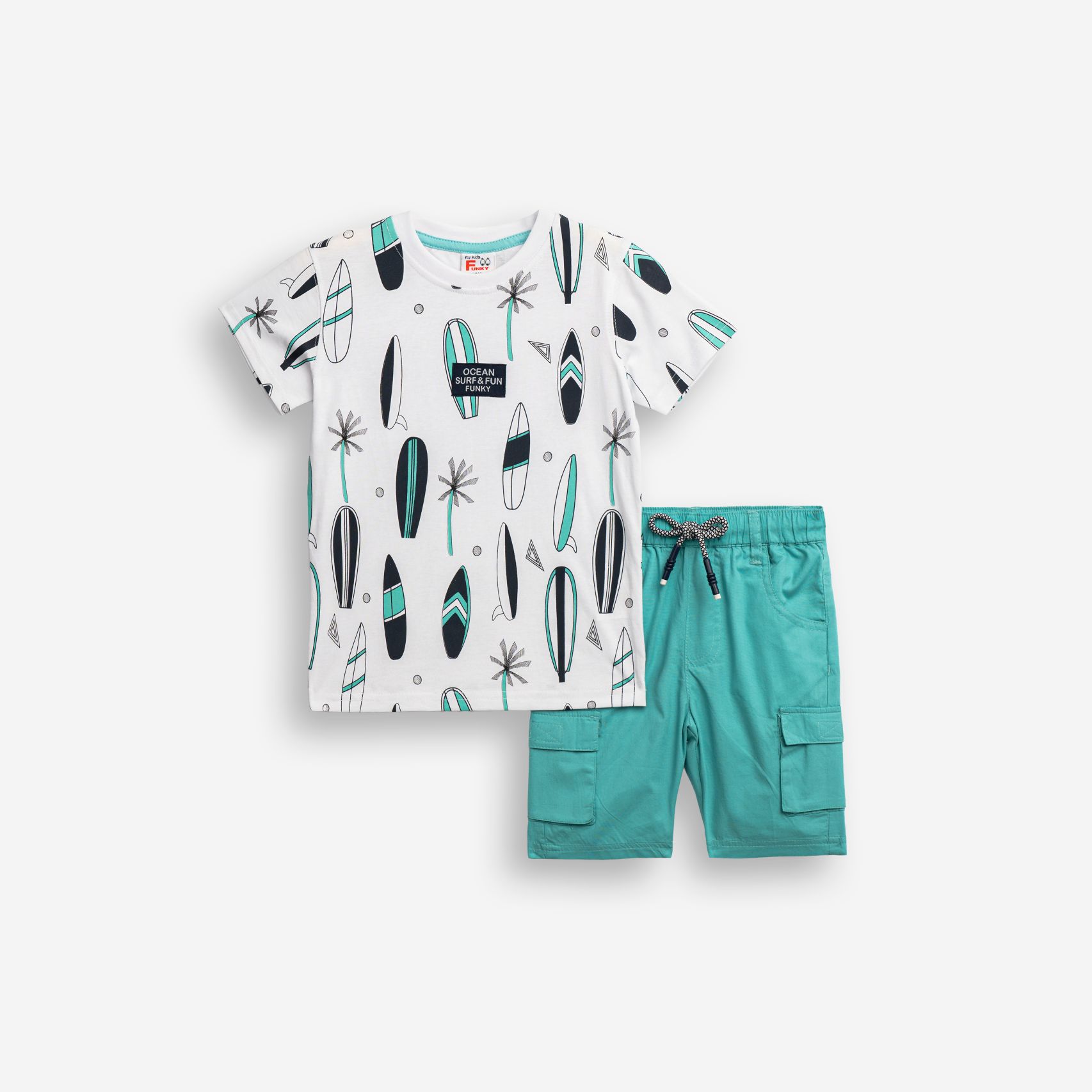 Σετ μπλούζα με τύπωμα (σανίδες surf) allover και βερμούδα σταθερή πάνω από το γόνατο με τσέπες σε χρώμα λευκό/τυρκουάζ για αγόρι 1-6 ετών
