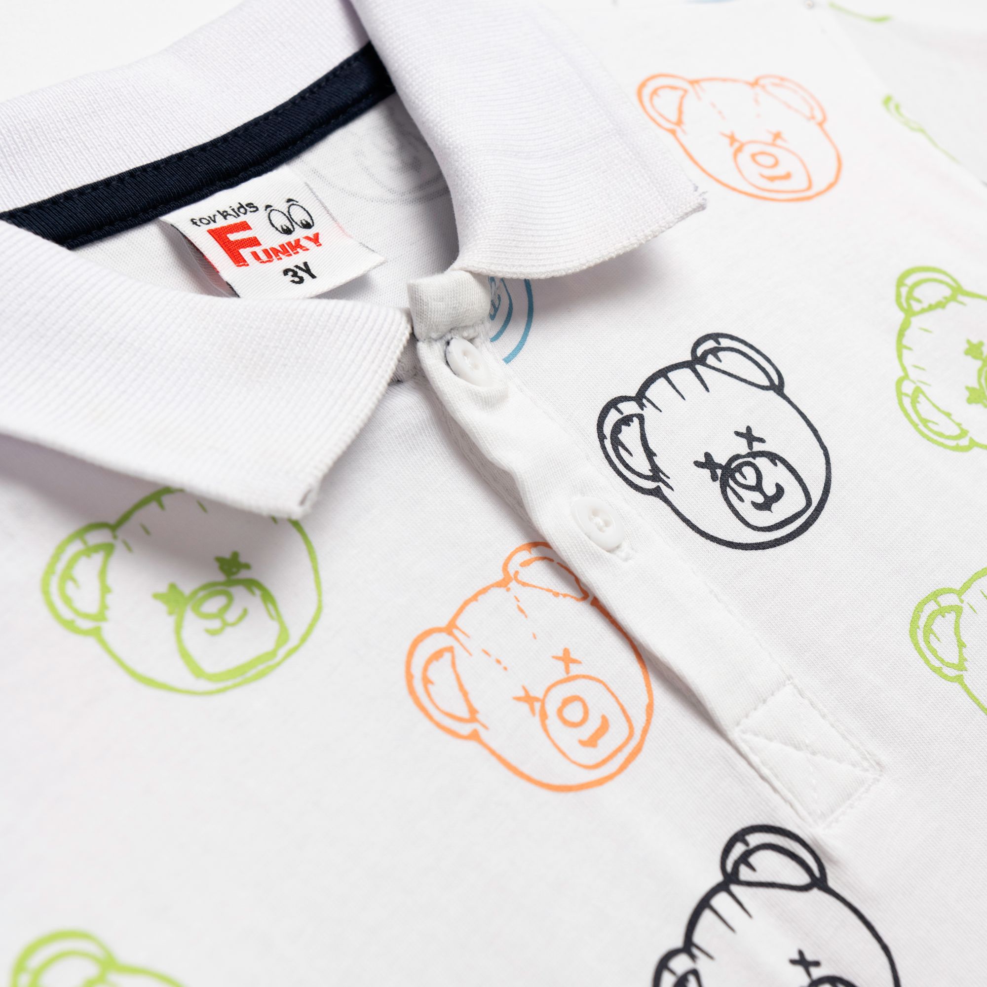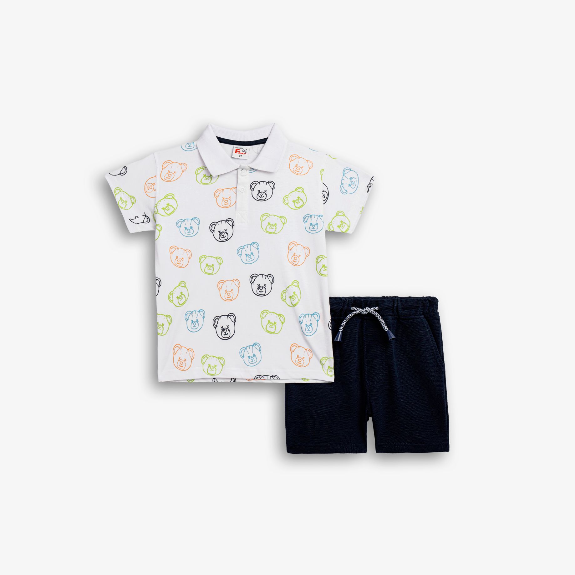 Σε κοντομάνικη μπλούζα πόλο κάλτσα με τύπωμα (αρκουδάκι) allover και βερμούδα πικέ σε χρώμα λευκό/μπλέ για αγόρι 1-6 ετών