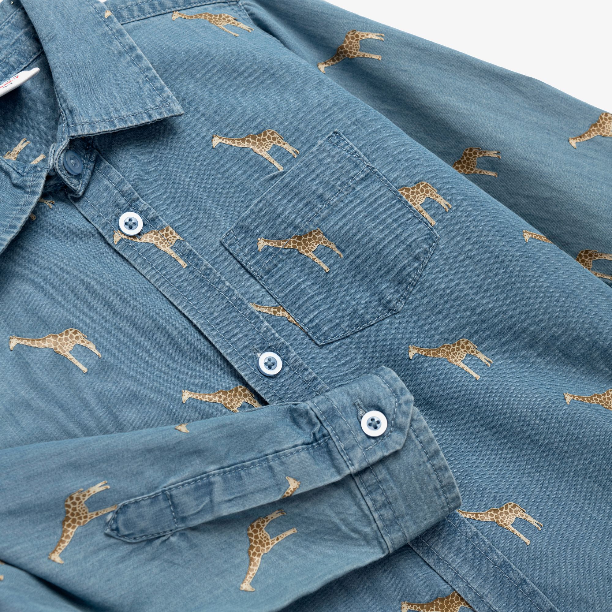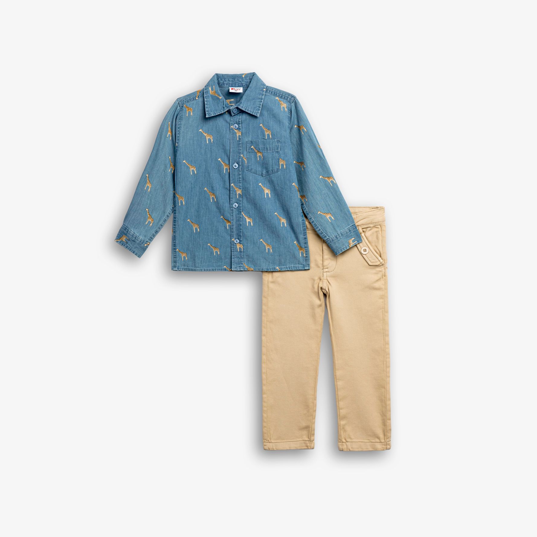 Σετ πουκάμισο μακρυμάνικο τζίν με τύπωμα (καμηλοπάρδαλη) allover και παντελόνι σε χρώμα τζίν/μπέζ άμμου για αγόρι 1-6 ετών