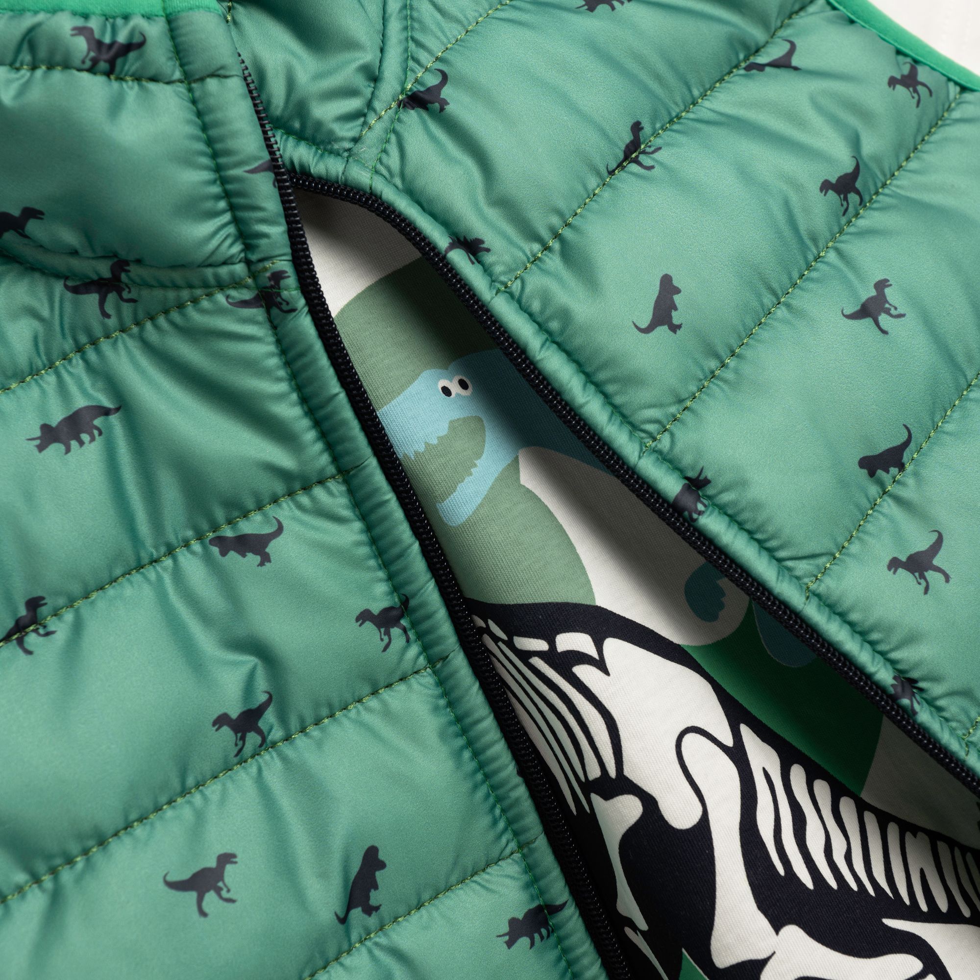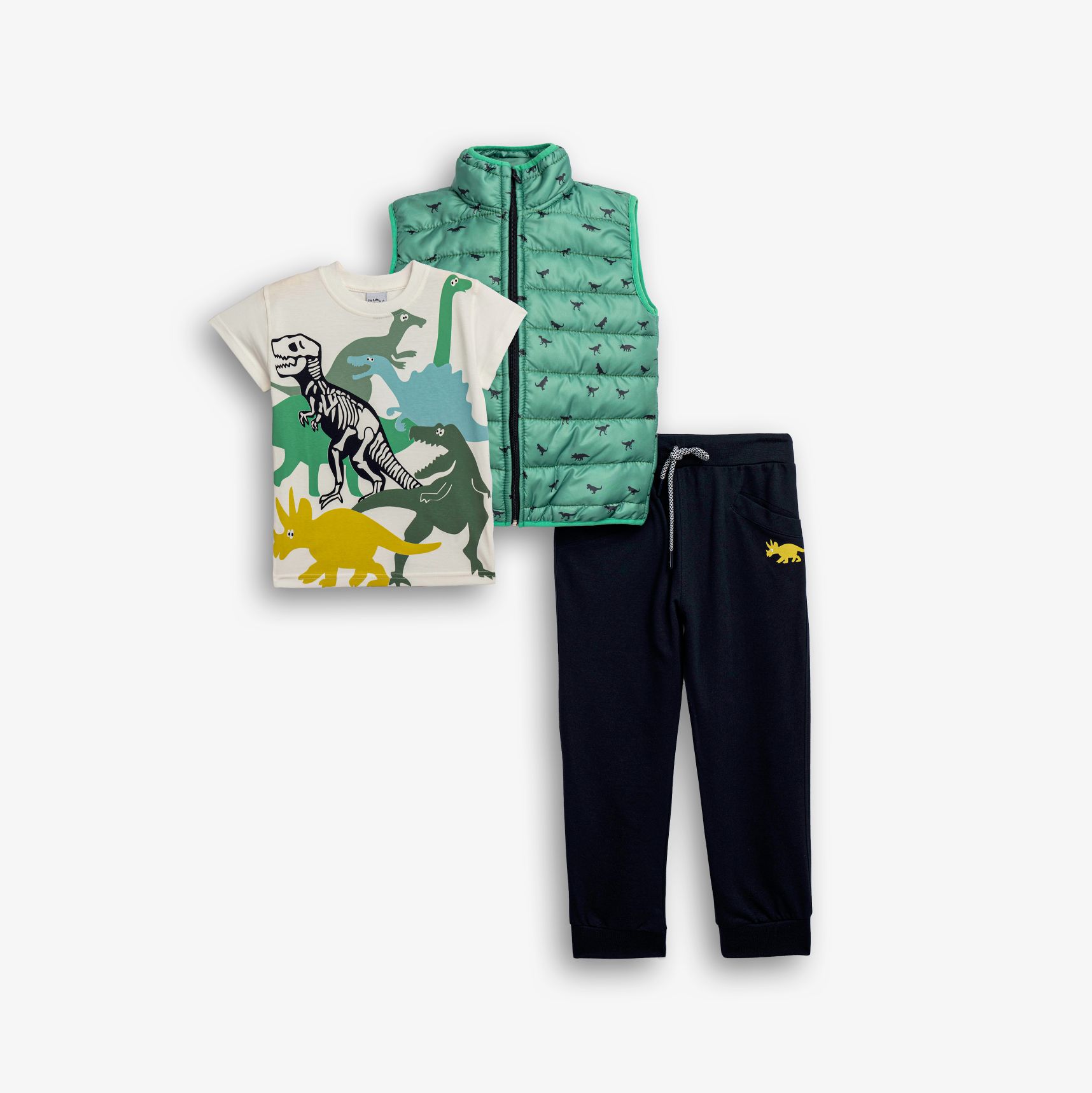 Σετ 3 τεμάχια τζάκετ αμάνικο με τύπωμα (δεινόσαυρους) allover και μπλούζα κοντομάνικη κάλτσα με τύπωμα και παντελόνι φόρμας με τύπωμα σε χρώμα leprechaun/εκρού/μπλέ για αγόρι 1-6 ετών
