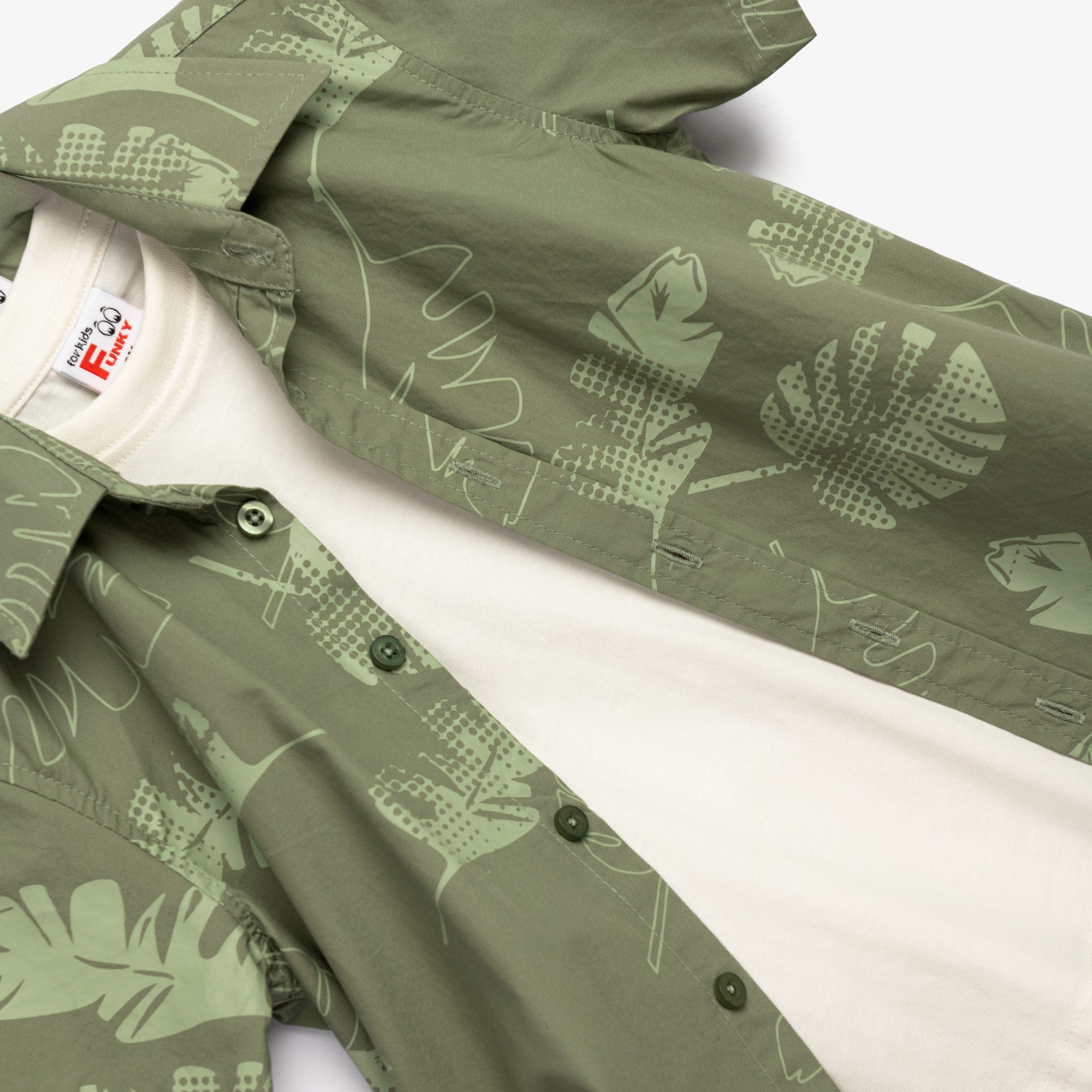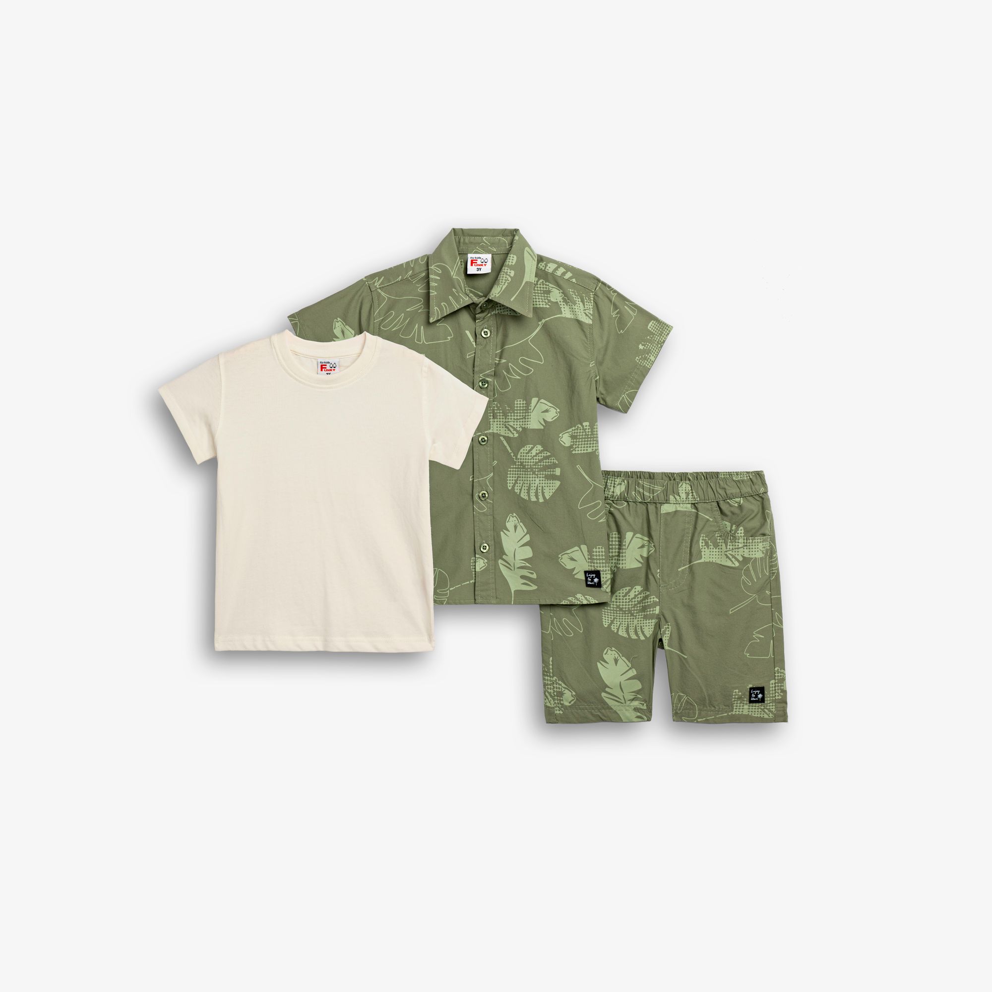Σετ 3 τεμάχια πουκάμισο κοντομάνικο ποπλίνα με τύπωμα (φύλλα) allover και μπλούζα κάλτσα κοντομάνικη και βερμούδα ποπλίνα με τύπωμα allover σε χρώμα ανοιχτό χακί/εκρού/ανοιχτό χακί για αγόρι 1-6 ετών