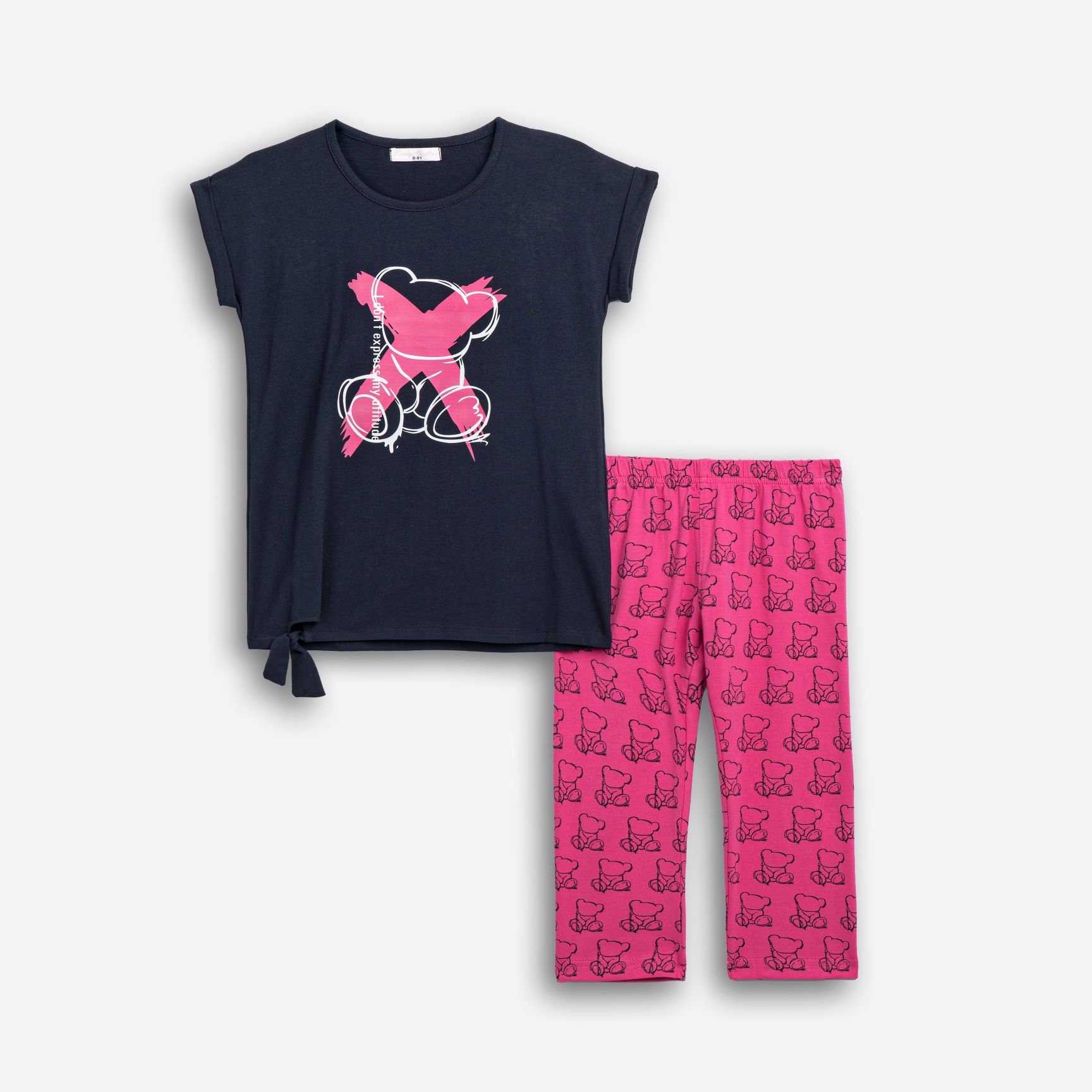 Μπλουζοφόρεμα με τύπωμα (αρκουδάκι) και κολάν κάλτσα κάπρι λύκρα με τύπωμα allover σε χρώμα μπλέ/φούξ για κορίτσι 6-16 ετών