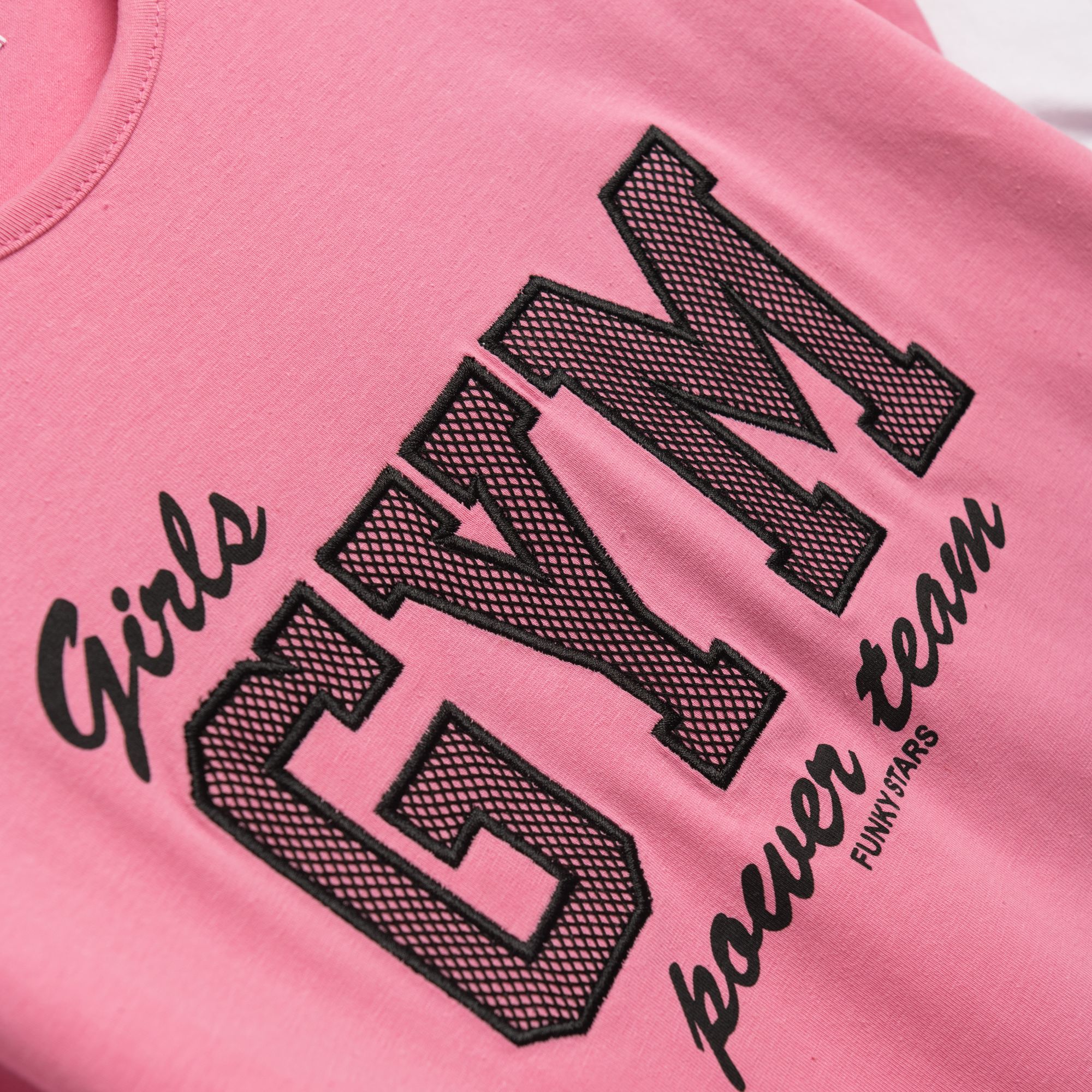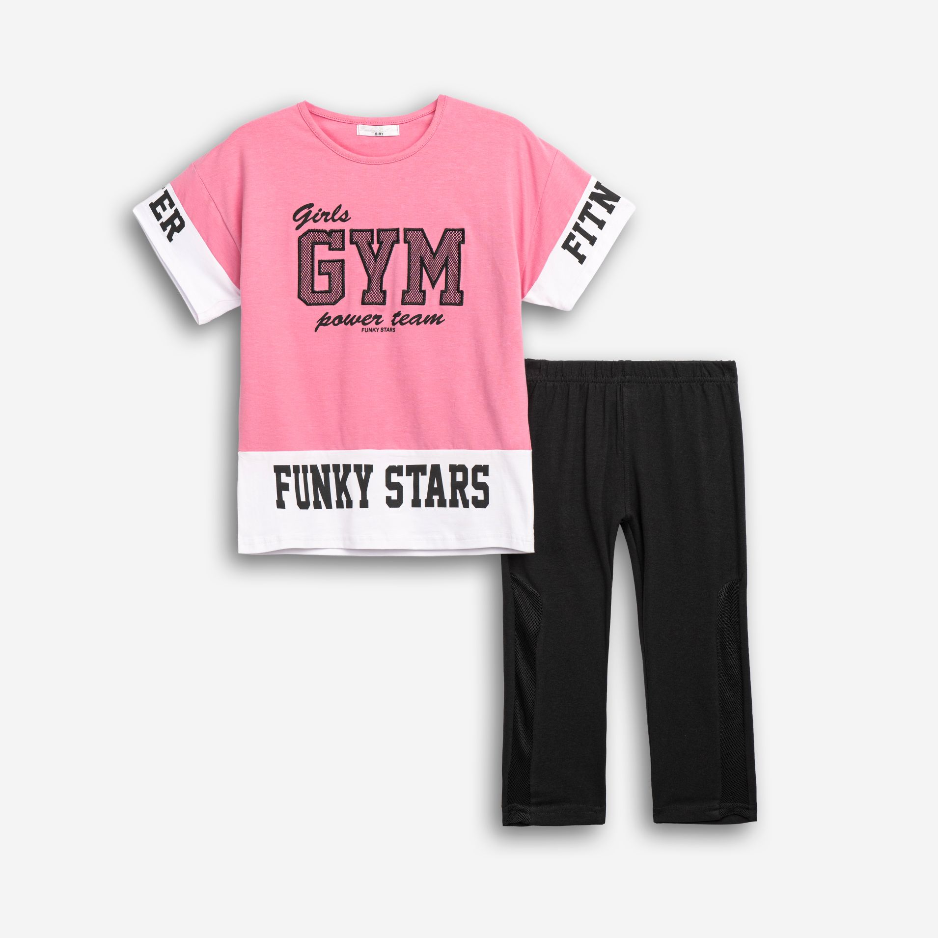 Μπλουζοφόρεμα με τύπωμα (girls gym) και κολάν κάλτσα κάπρι λύκρα σε χρώμα candy pink-λευκό/μαύρο για κορίτσι 6-16 ετών