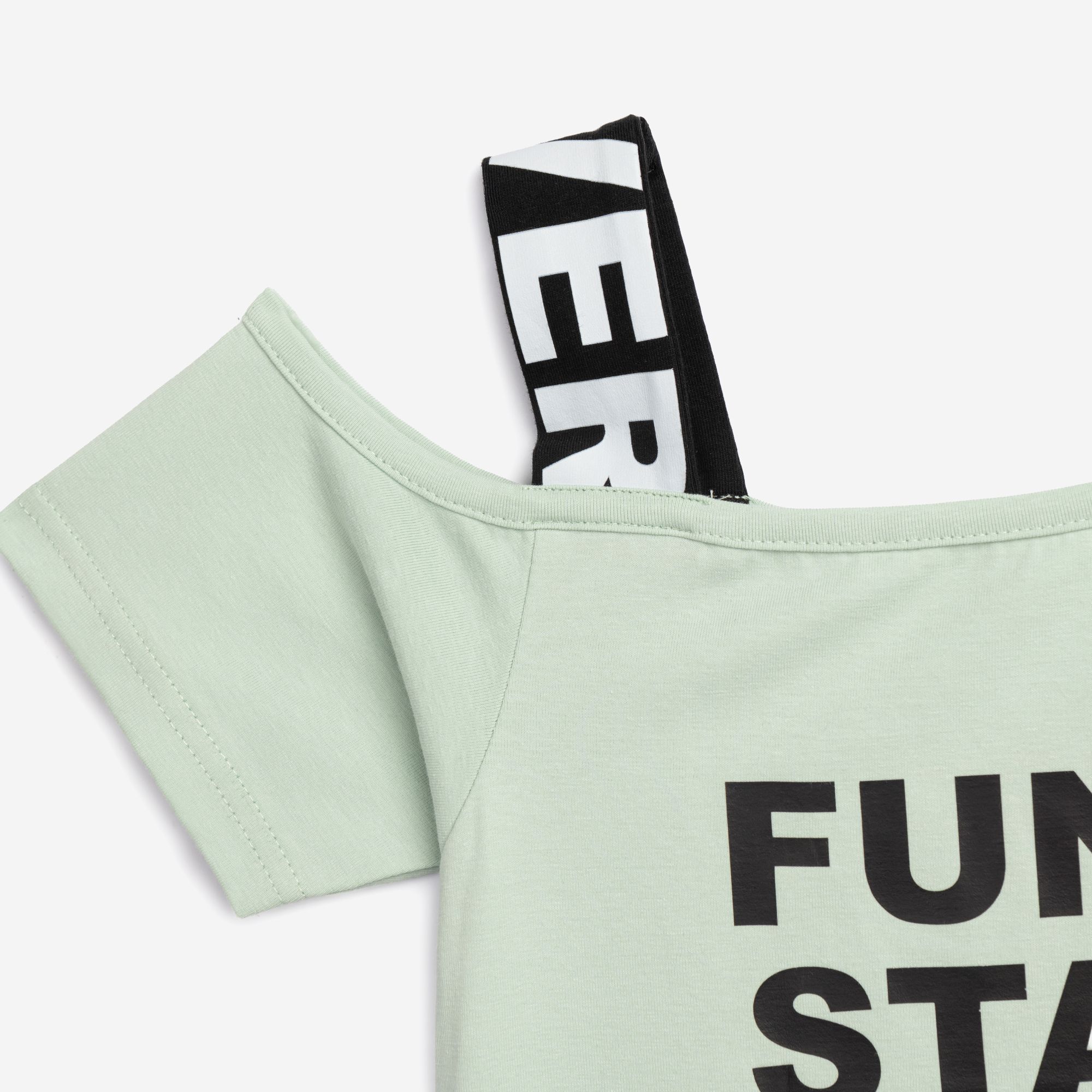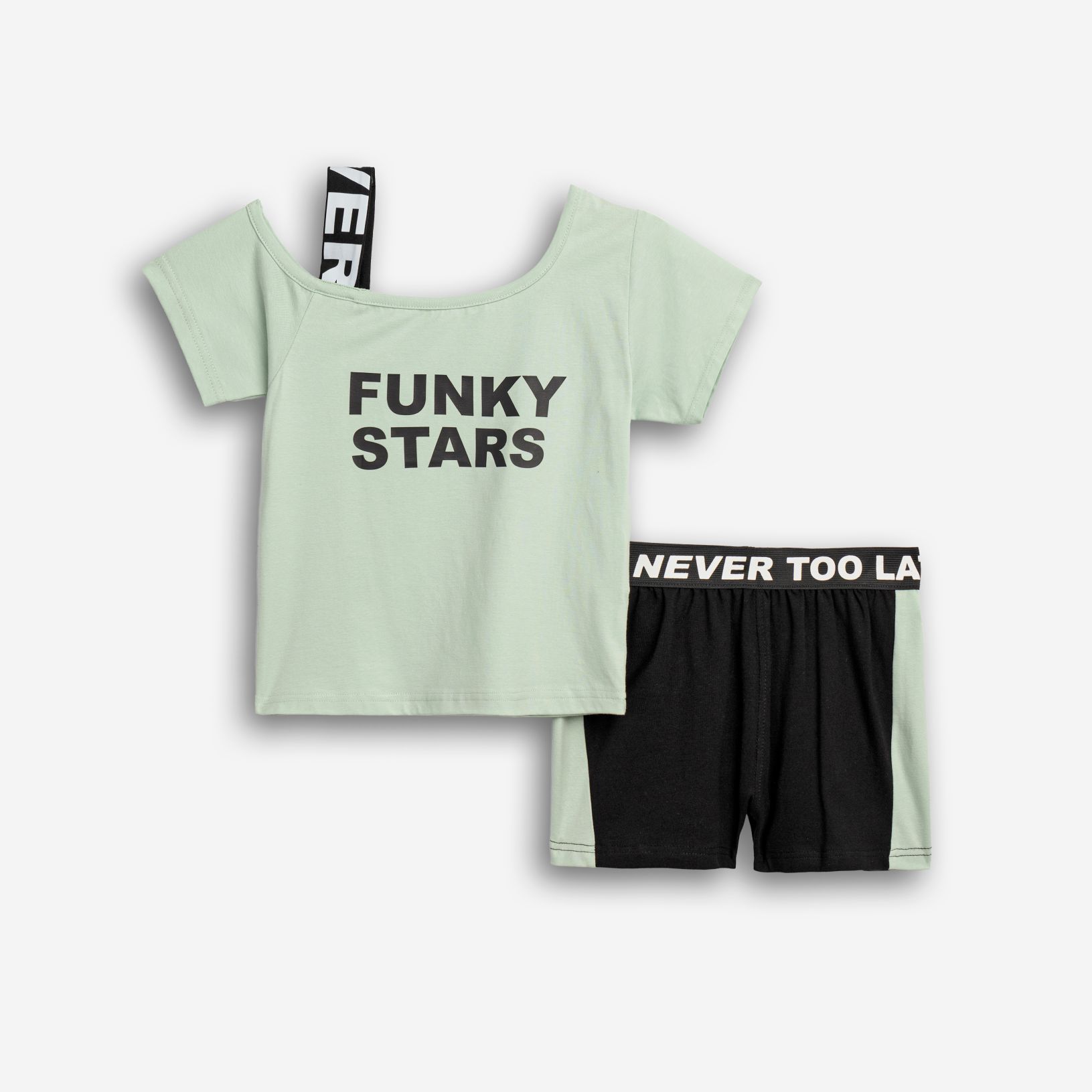Σετ μπλουζάκι με τύπωμα (funky stars) και σόρτς κάλτσα λύκρα σε χρώμα φυστικί/μαύρο-φυστικί για κορίτσι 6-16 ετών