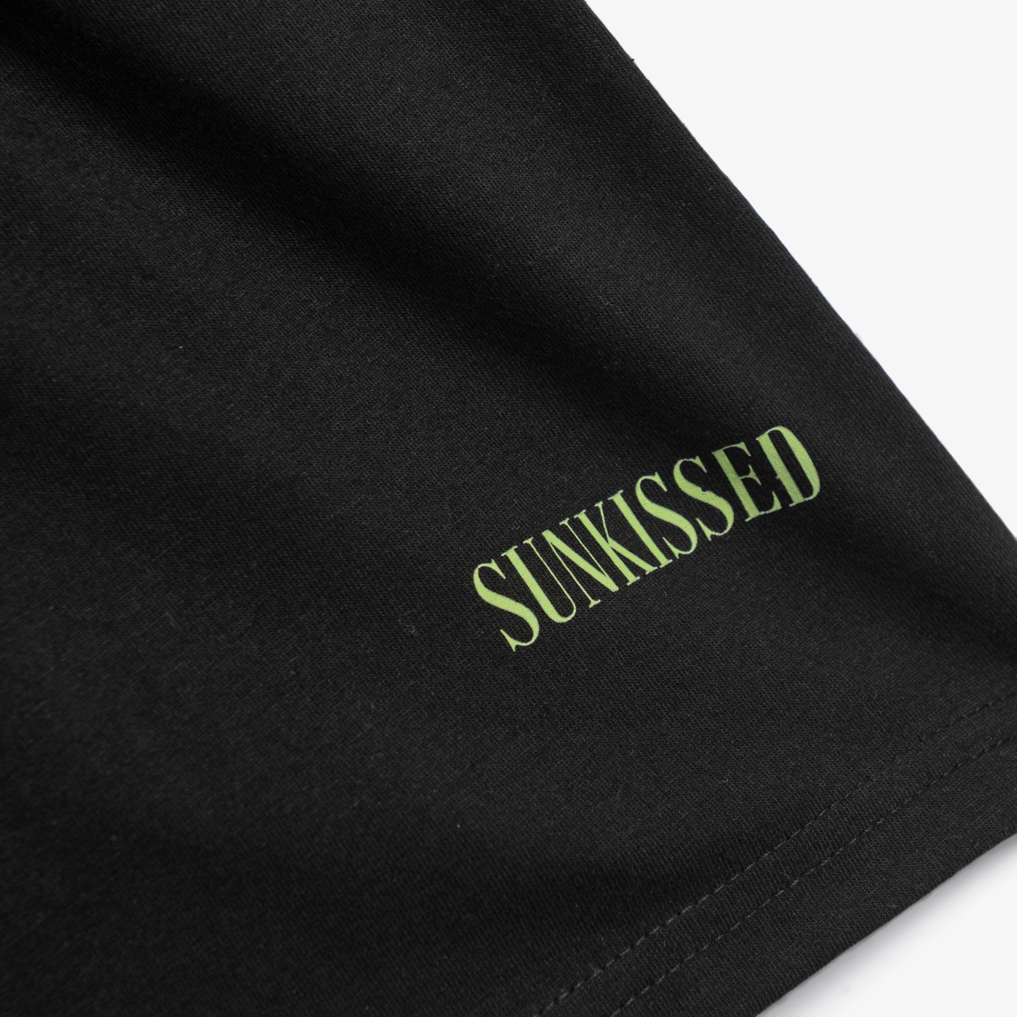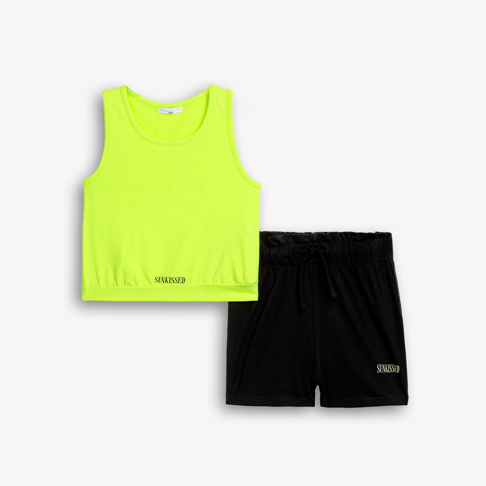 Σετ μπλουζάκι με τύπωμα (sunkissed) και σόρτς κάλτσα λύκρα με τύπωμα σε χρώμα φωσφορούχο πεπονί/μαύρο για κορίτσι 6-16 ετών