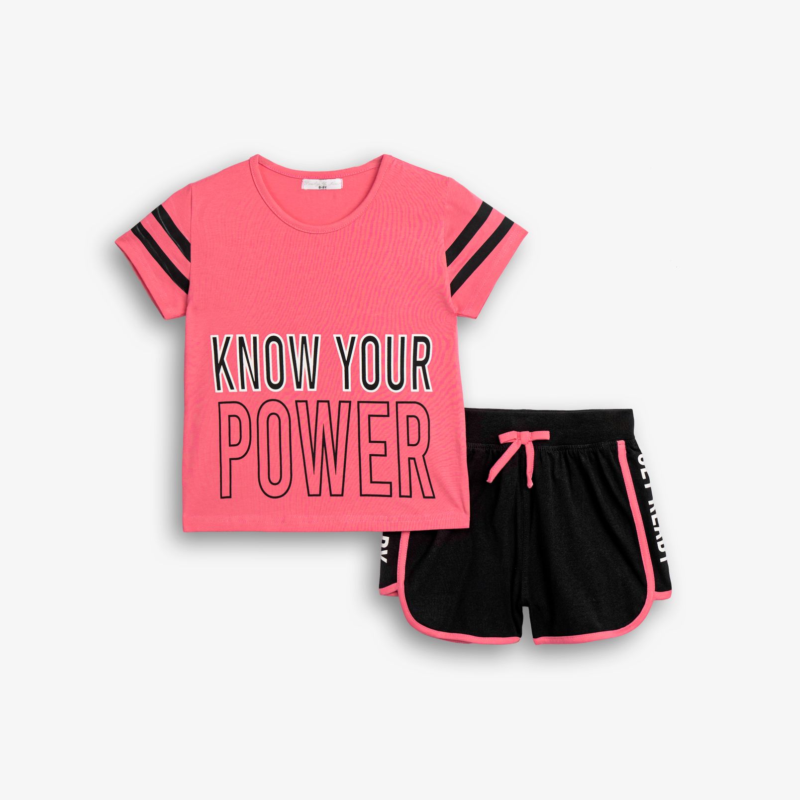 Σετ μπλουζάκι με τύπωμα (know your power) και σόρτς κάλτσα λύκρα με τύπωμα σε χρώμα φλαμίνγκο/μαύρο για κορίτσι 6-16 ετών
