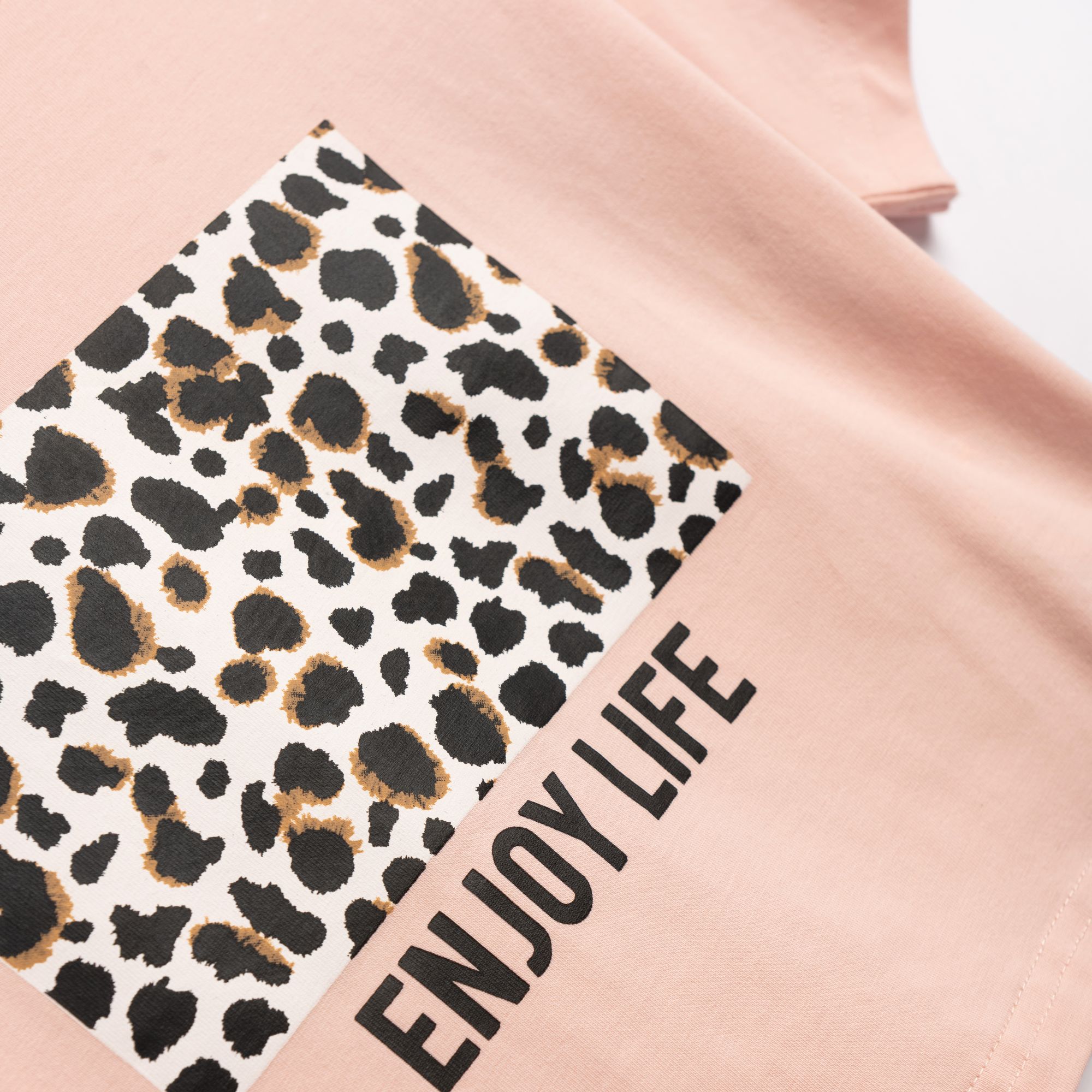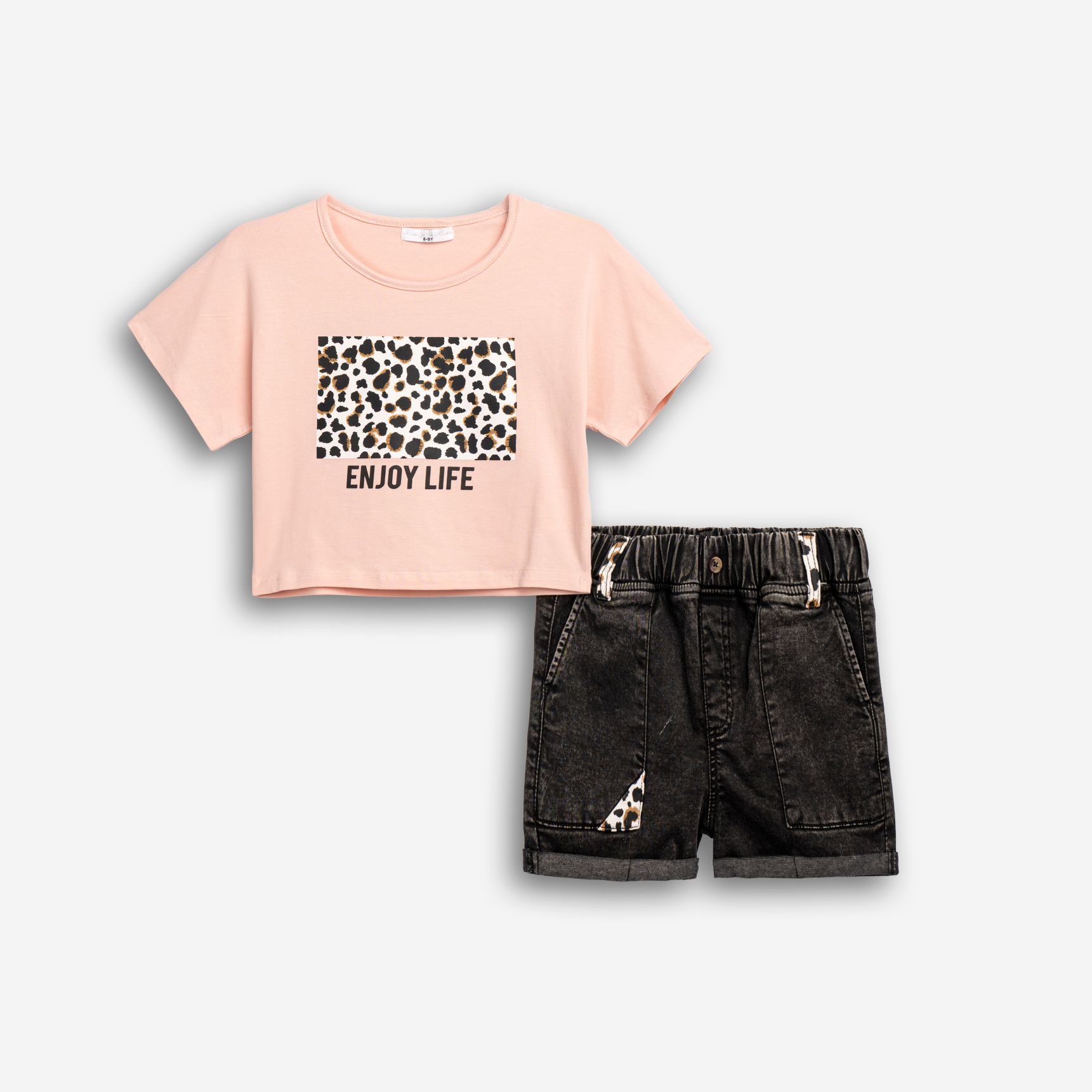Σετ μπλούζα κάλτσα λύκρα με τύπωμα (enjoy life) και σόρτς τζίν λύκρα σε χρώμα ροζ πούδρας/τζίν για κορίτσι 6-16 ετών