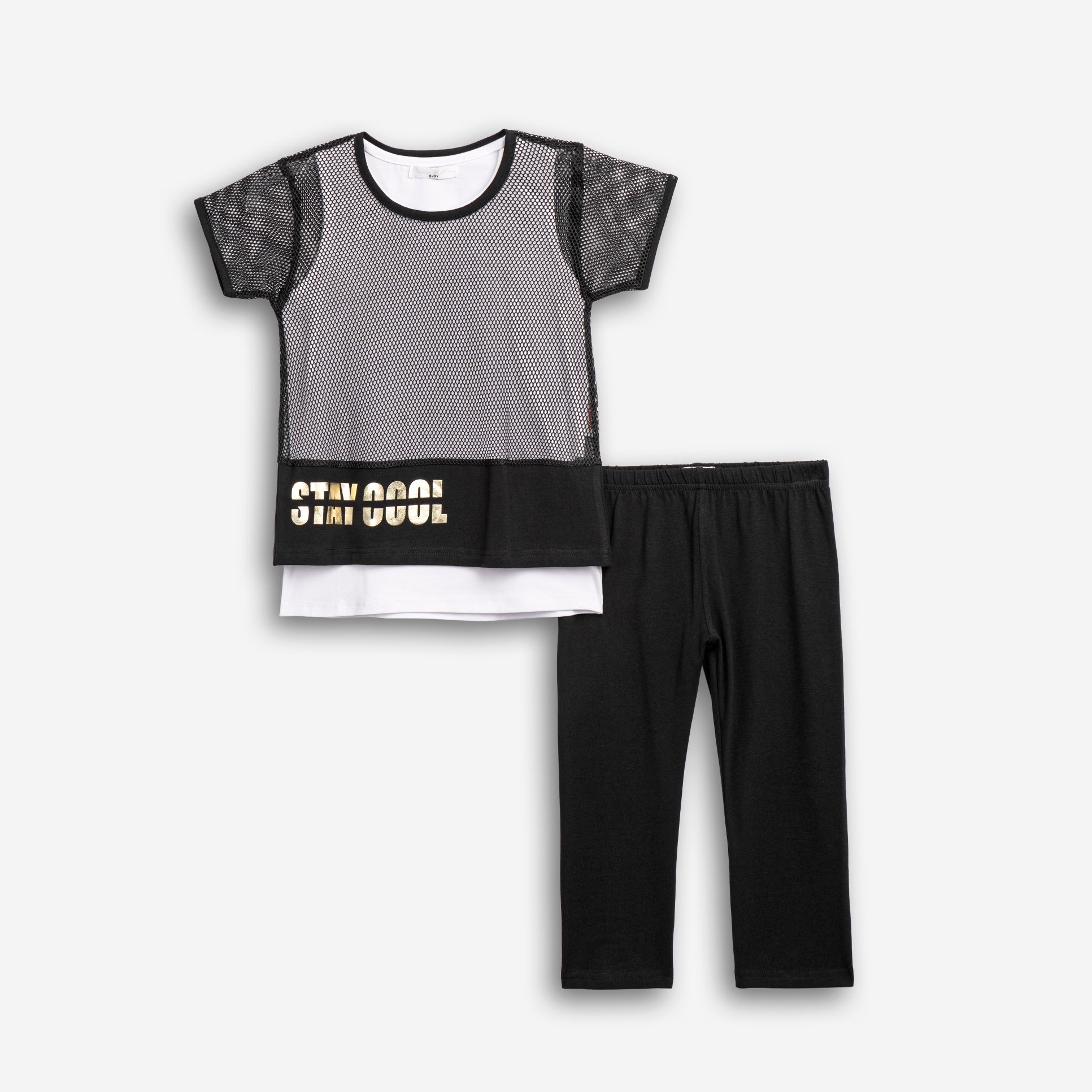 Σετ 3 τεμάχια μπλούζα δίχτυ με τύπωμα (stay cool) και μπλουζα και κολάν κάπρι κάλτσα λύκρα σε χρώμα μαύρο/λευκό/μαύρο για κορίτσι 6-16 ετών