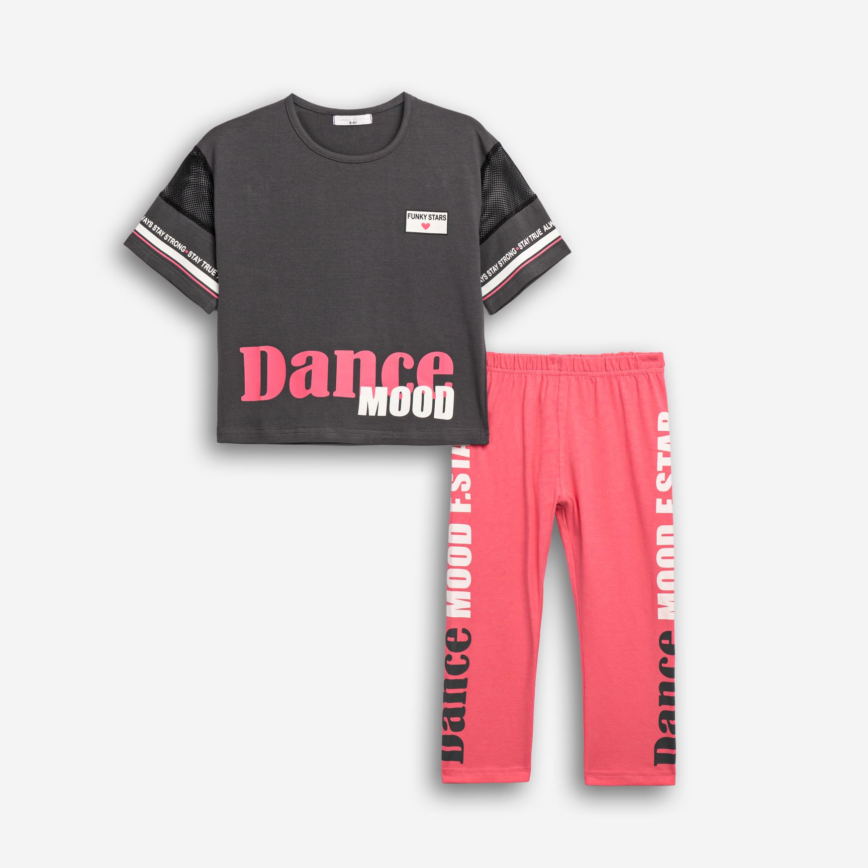 Σετ μπλούζα με τύπωμα (dance) και κολάν κάπρι κάλτσα λύκρα με τύπωμα σε χρώμα ανθρακί/φλαμίνγκο για κορίτσι 6-16 ετών