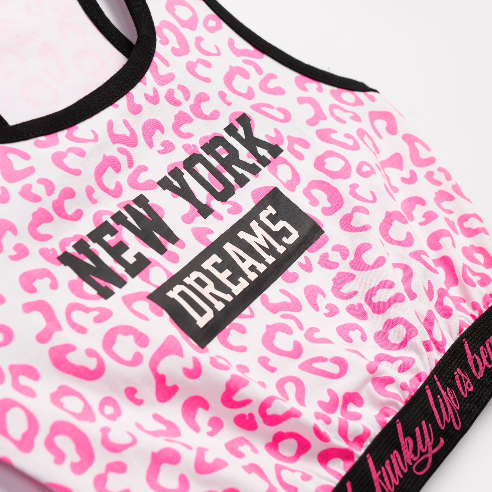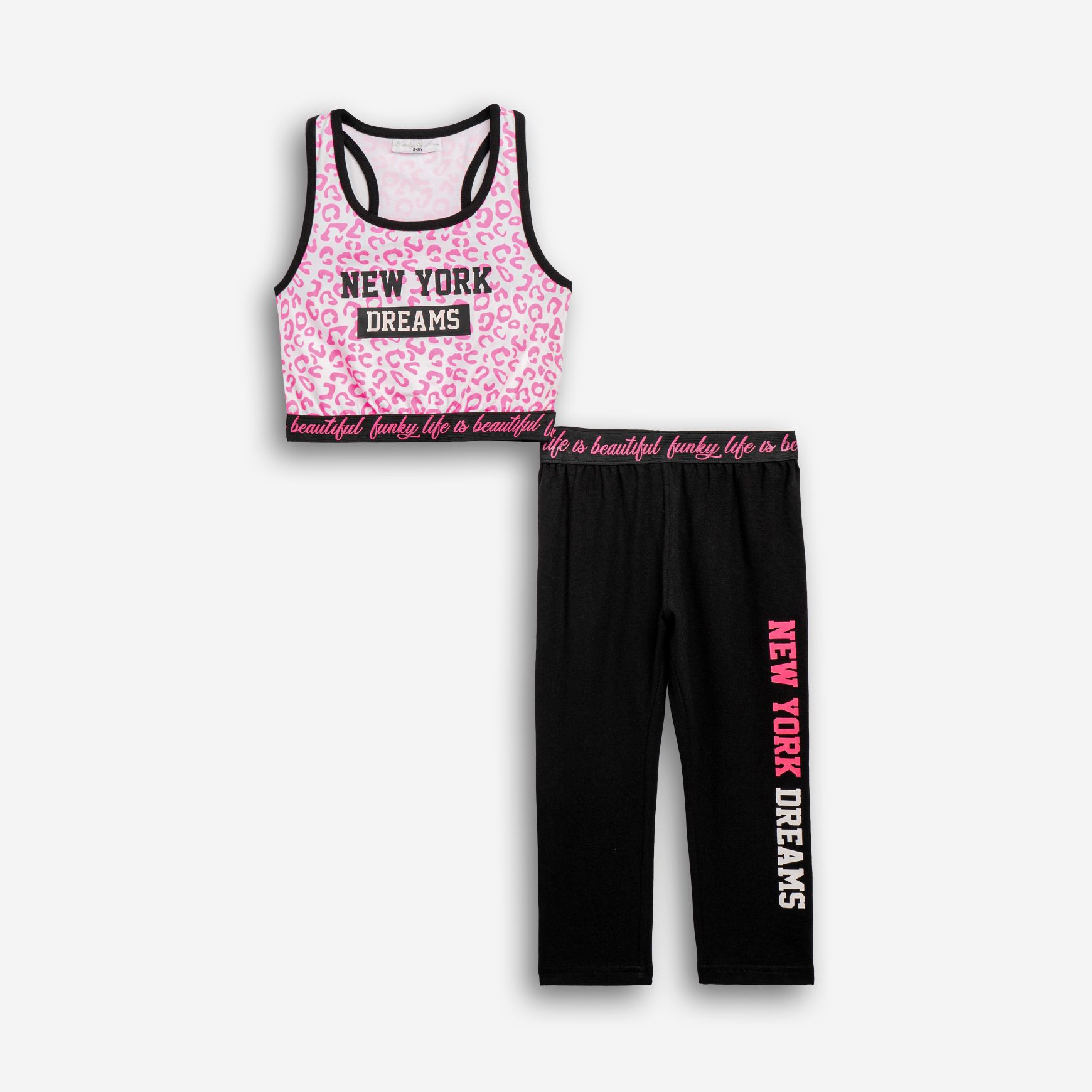 Σετ μπλούζα τοπ με τύπωμα (new york dreams-λεοπάρ) allover και κολάν κάτω από το γόνατο κάλτσα λύκρα με τύπωμα σε χρώμα λευκό/μαύρο για κορίτσι 6-16 ετών