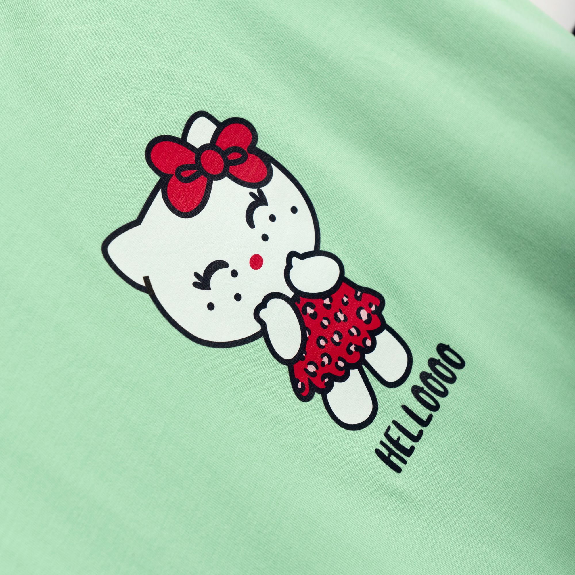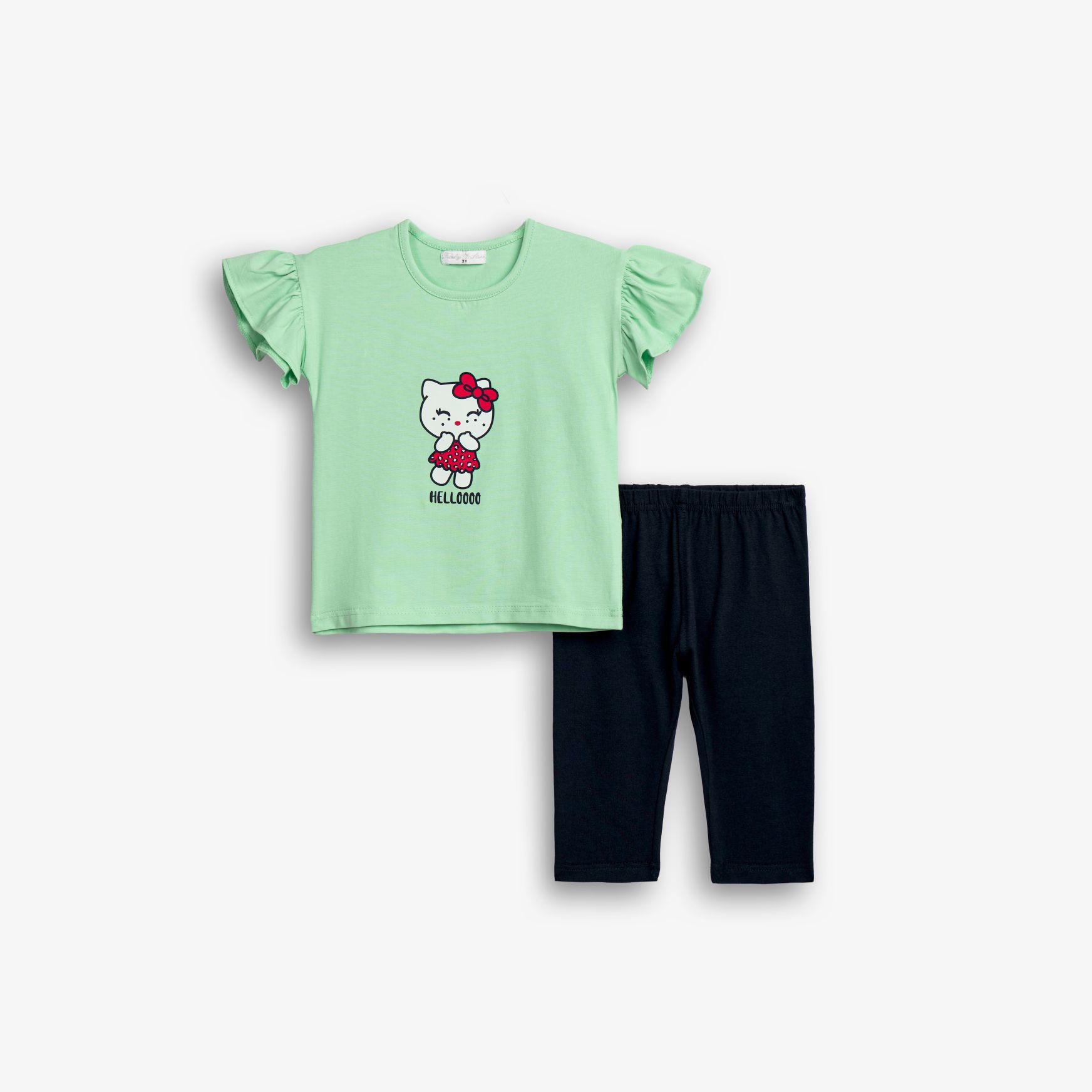Μπλουζοφόρεμα με τύπωμα (γατάκι) και κολάν κάπρι κάλτσα λύκρα με τύπωμα allover σε χρώμα μέντα/μπλέ για κορίτσι 1-6 ετών