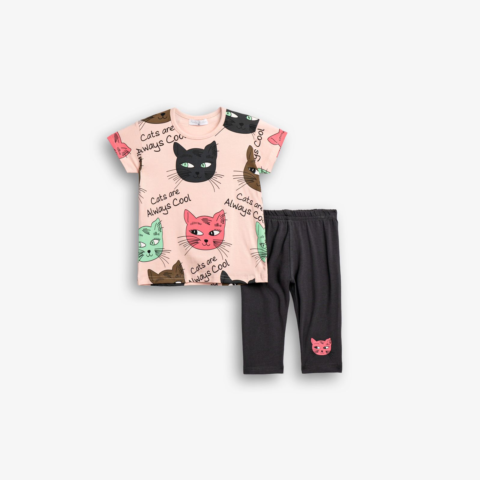 Μπλουζοφόρεμα με τύπωμα (γάτες) allover και κολάν κάπρι κάλτσα λύκρα σε χρώμα ροζ πούδρας/ανθρακί για κορίτσι 1-6 ετών