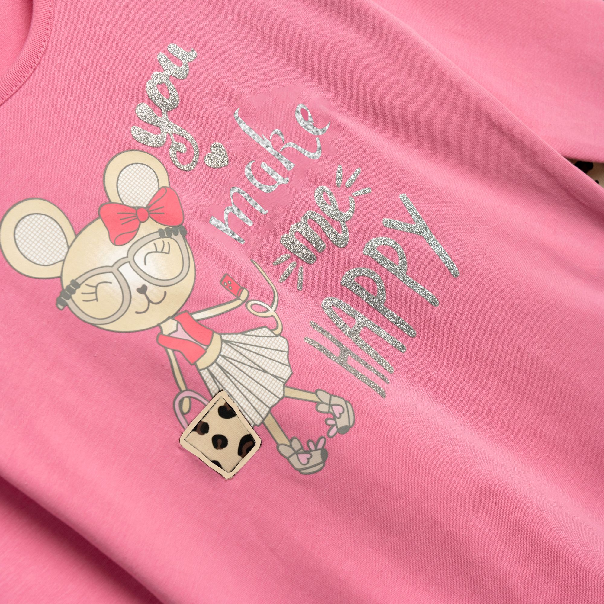 Μπλουζοφόρεμα μακρυμάνικο με τύπωμα (ποντικάκι) και κολάν μακρύ κάλτσα λύκρα με τύπωμα allover σε χρώμα candy pink/ανοιχτό μπέζ για κορίτσι 1-6 ετών