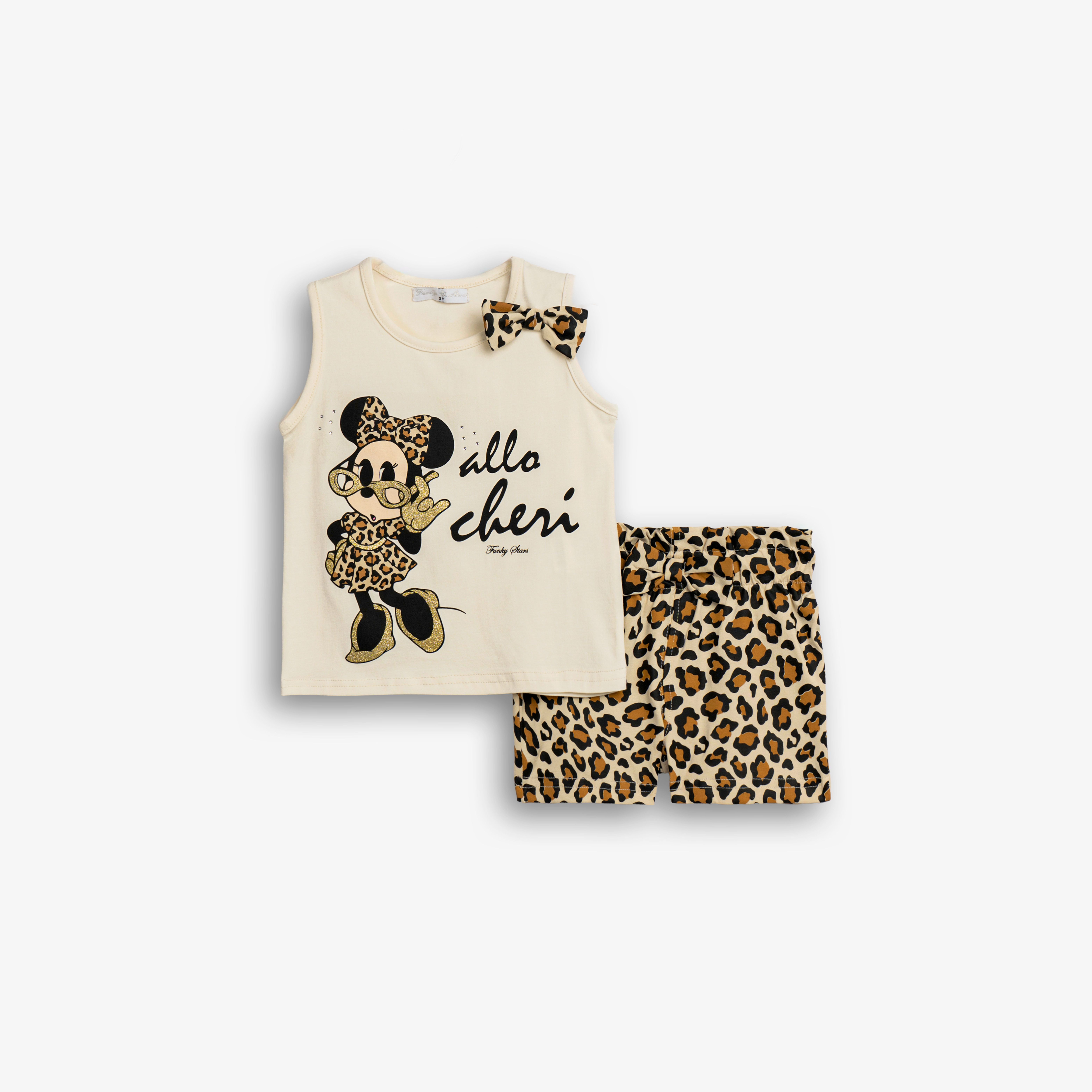 Σετ μπλούζα κάλτσα λύκρα με τύπωμα (minnie) και σόρτς με τύπωμα allover σε χρώμα εκρού/ανοιχτό μπέζ για κορίτσι 1-6 ετών