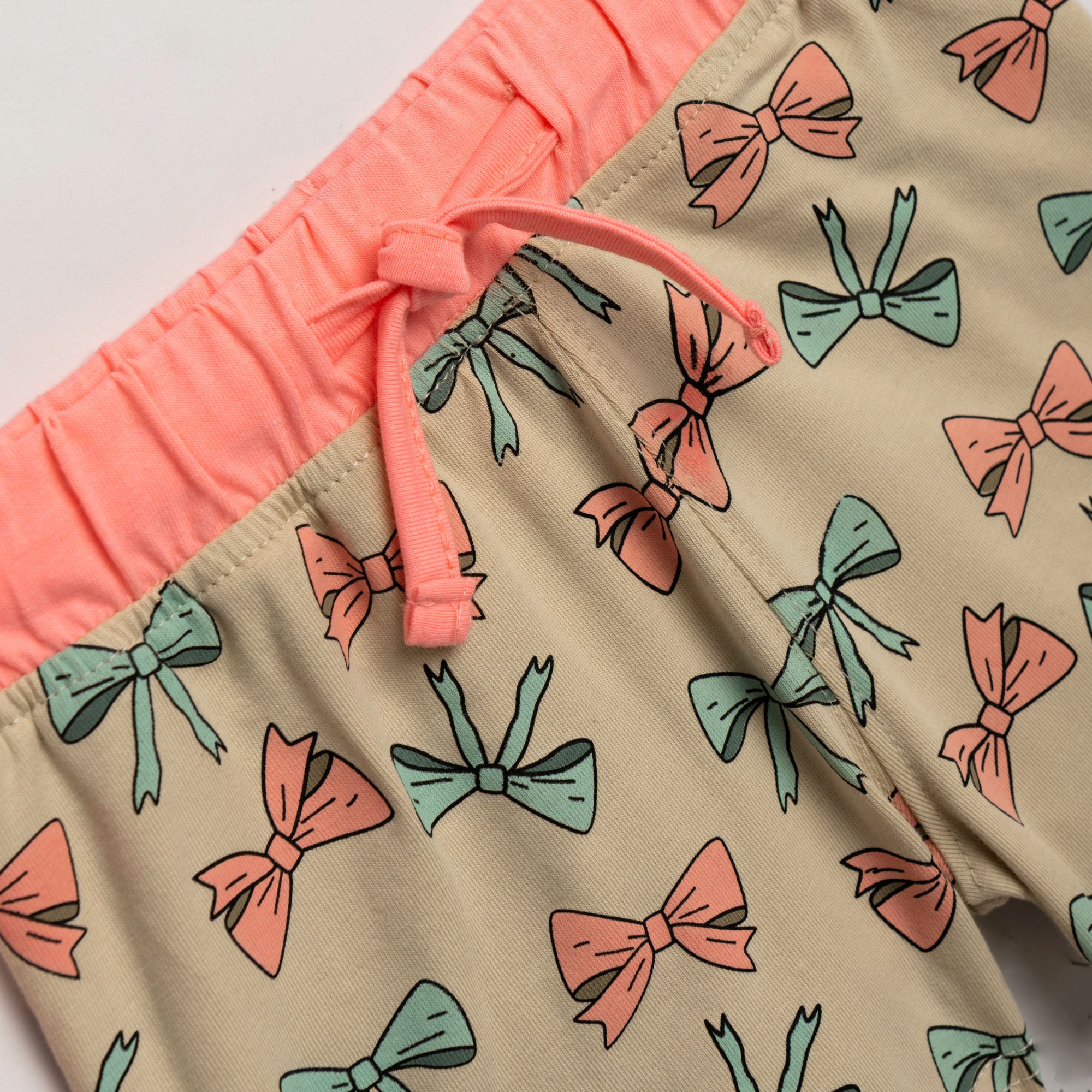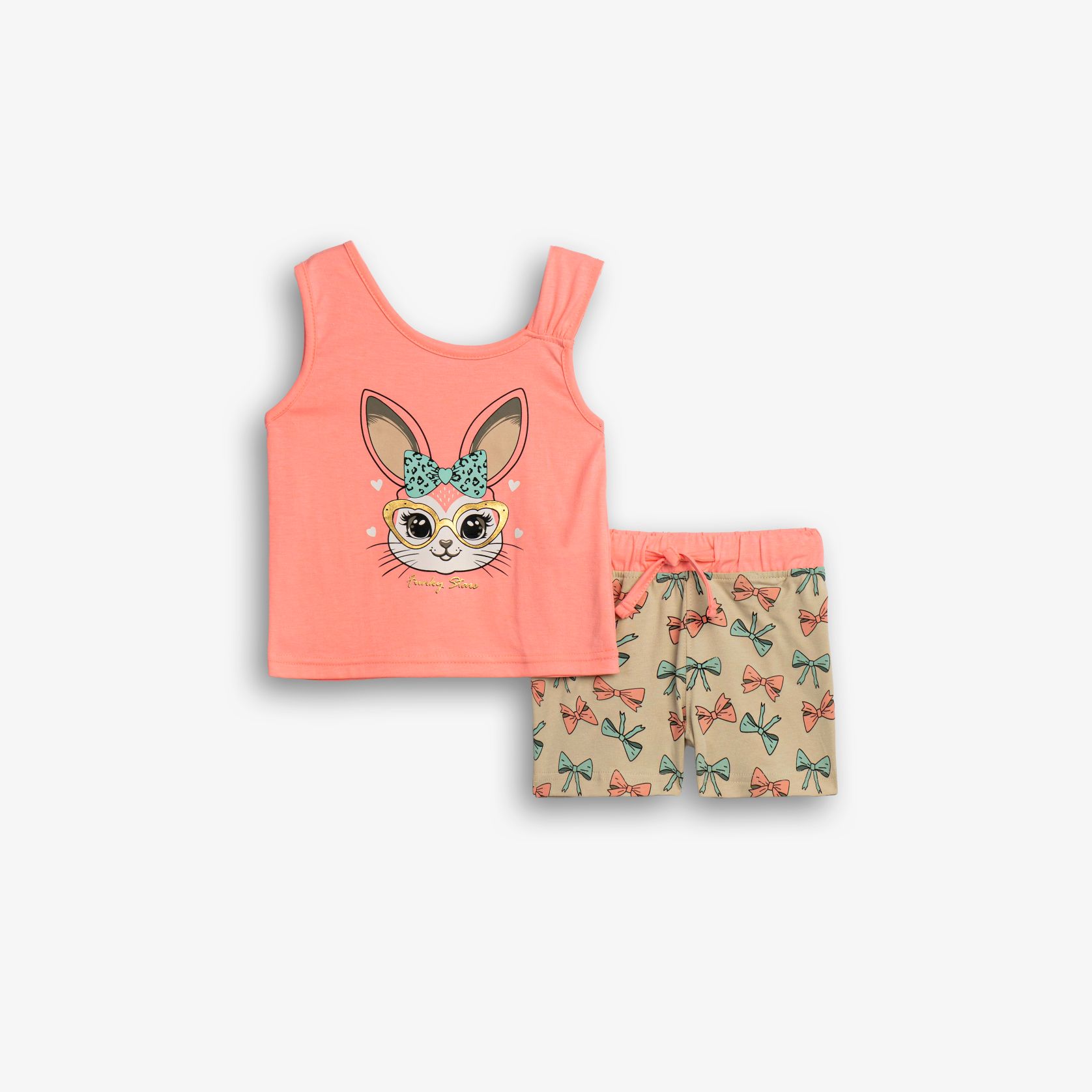 Σετ μπλούζα κάλτσα λύκρα με τύπωμα (κουνελακι) και σόρτς με τύπωμα allover σε χρώμα φωσφορούχο ανοιχτό σομόν/ανοιχτό μπέζ για κορίτσι 1-6 ετών