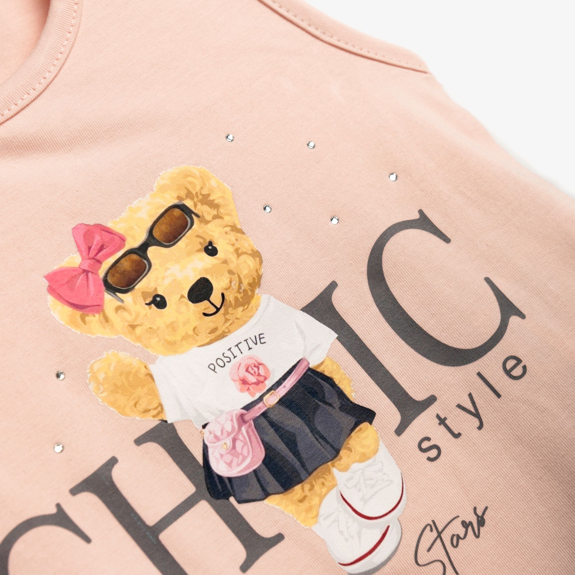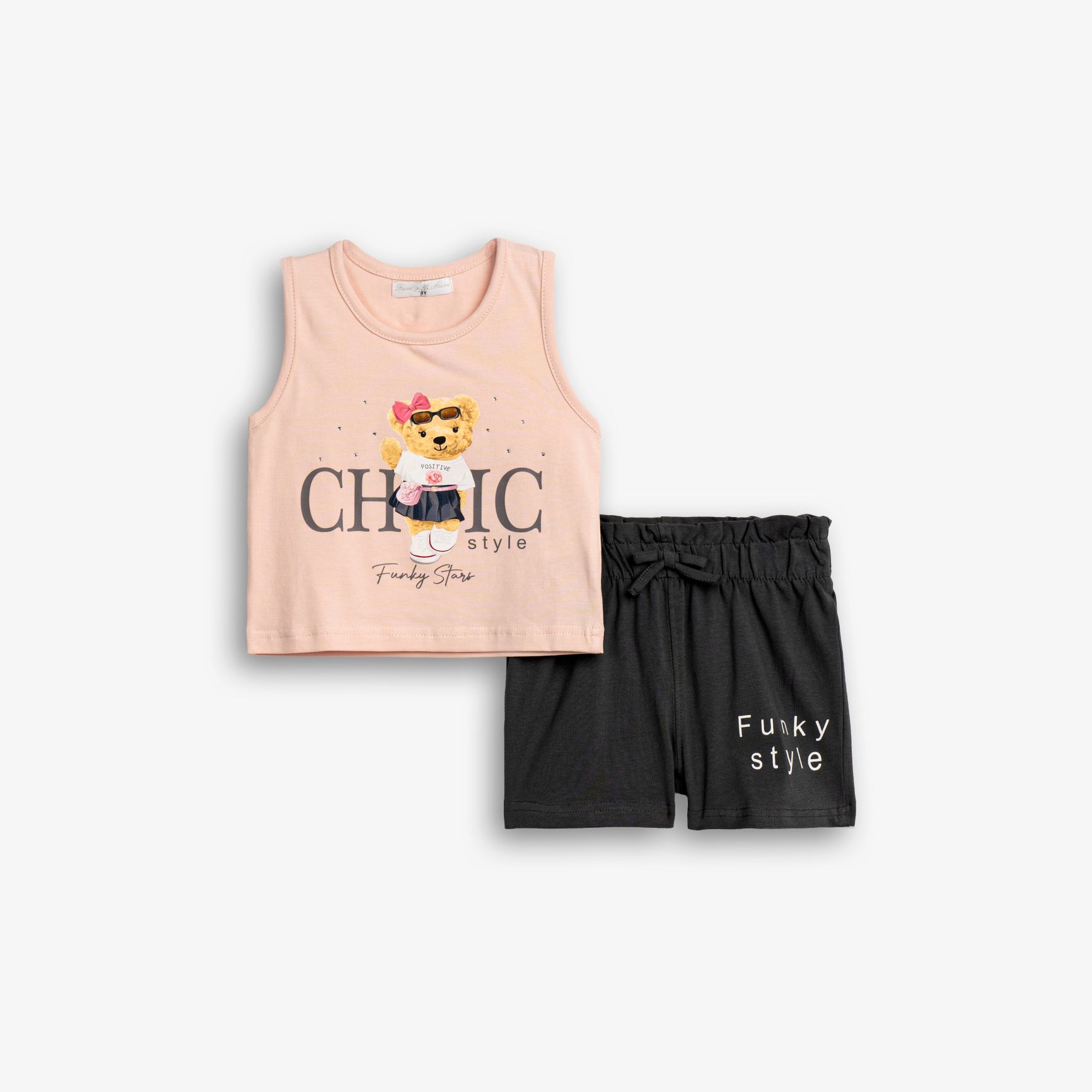 Σετ μπλούζα κάλτσα λύκρα με τύπωμα (αρκουδάκι) και σόρτς σε χρώμα ροζ πούδρας/ανθρακί για κορίτσι 1-6 ετών