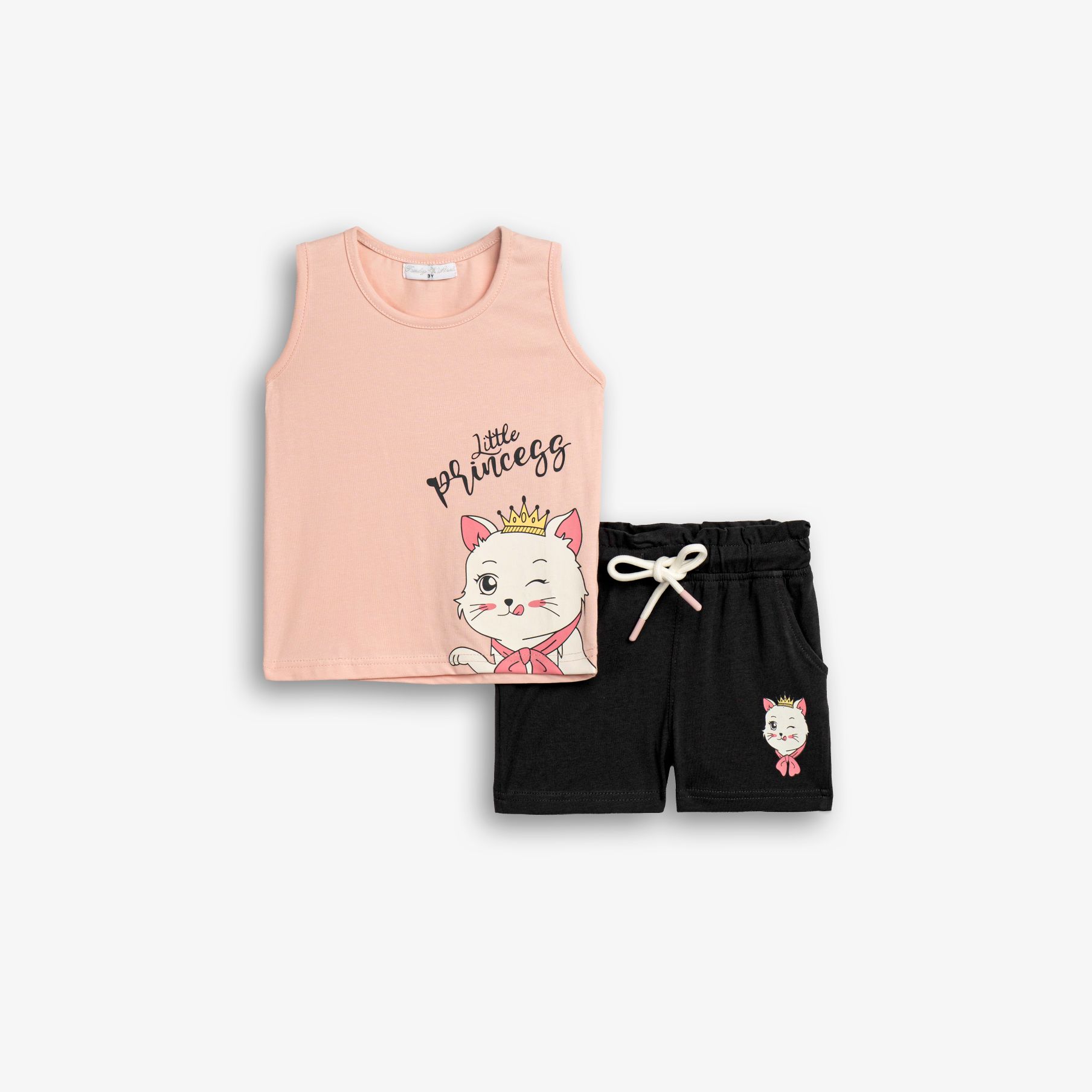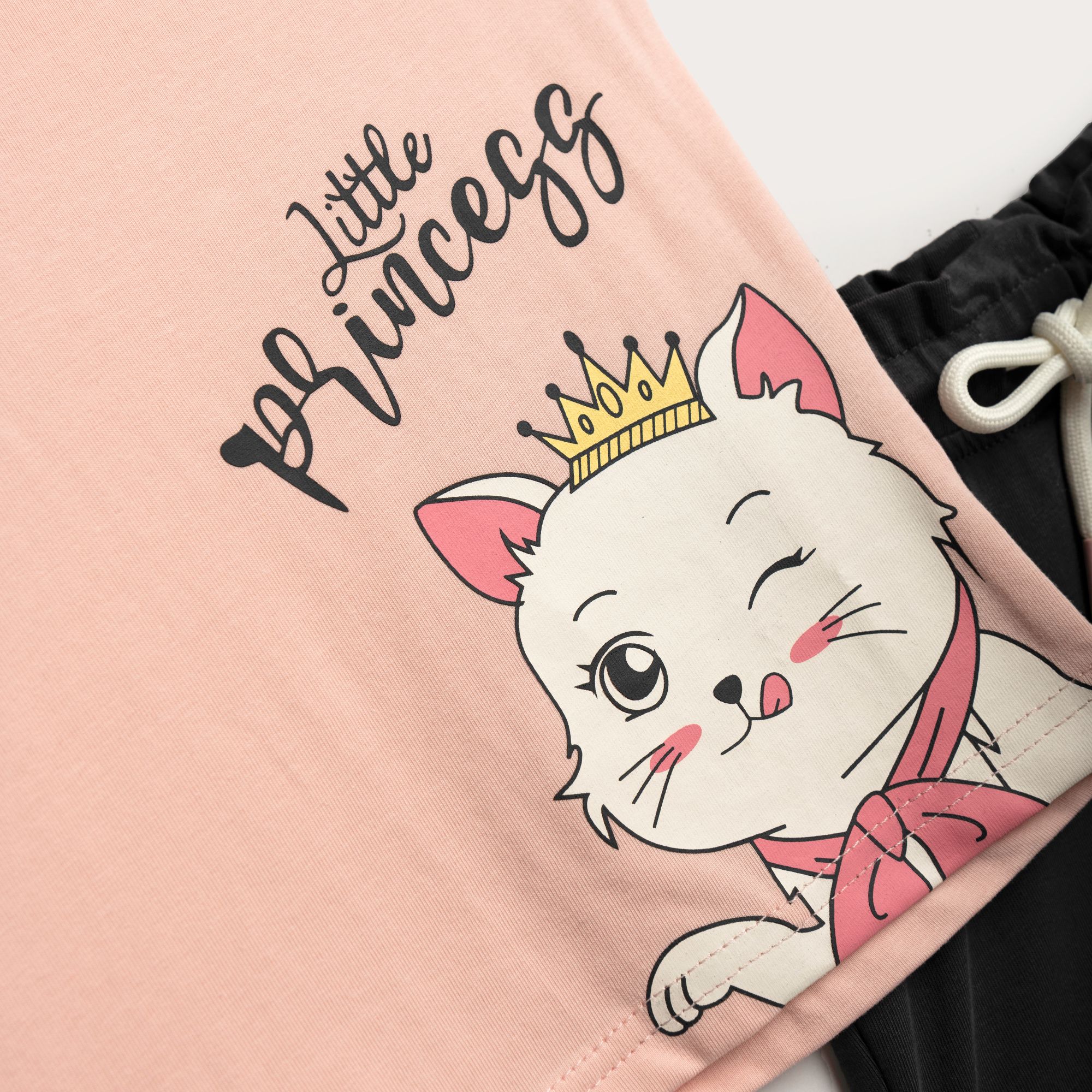 Σετ μπλούζα κάλτσα λύκρα με τύπωμα (γάτα) και σόρτς με τύπωμα σε χρώμα ροζ πούδρας/ανθρακί για κορίτσι 1-6 ετών
