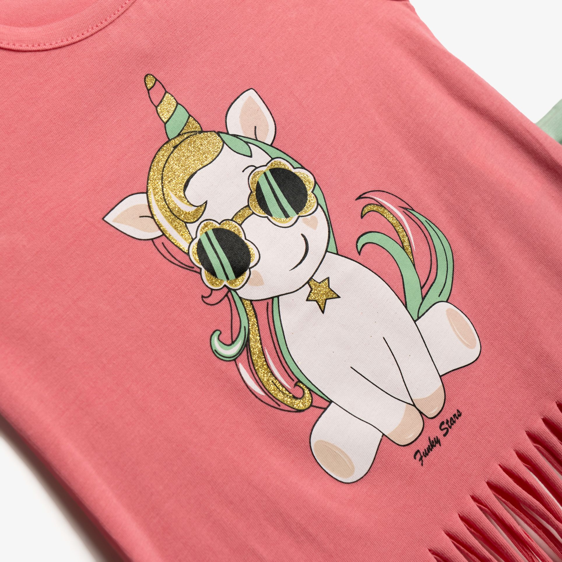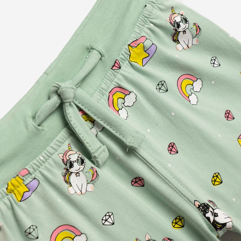 Σετ μπλούζα καλτσα λύκρα με τύπωμα (μονόκερο) και κρόσια και σόρτς με τύπωμα allover σε χρώμα crayon rouge/φυστικί για κορίτσι 1-6 ετών