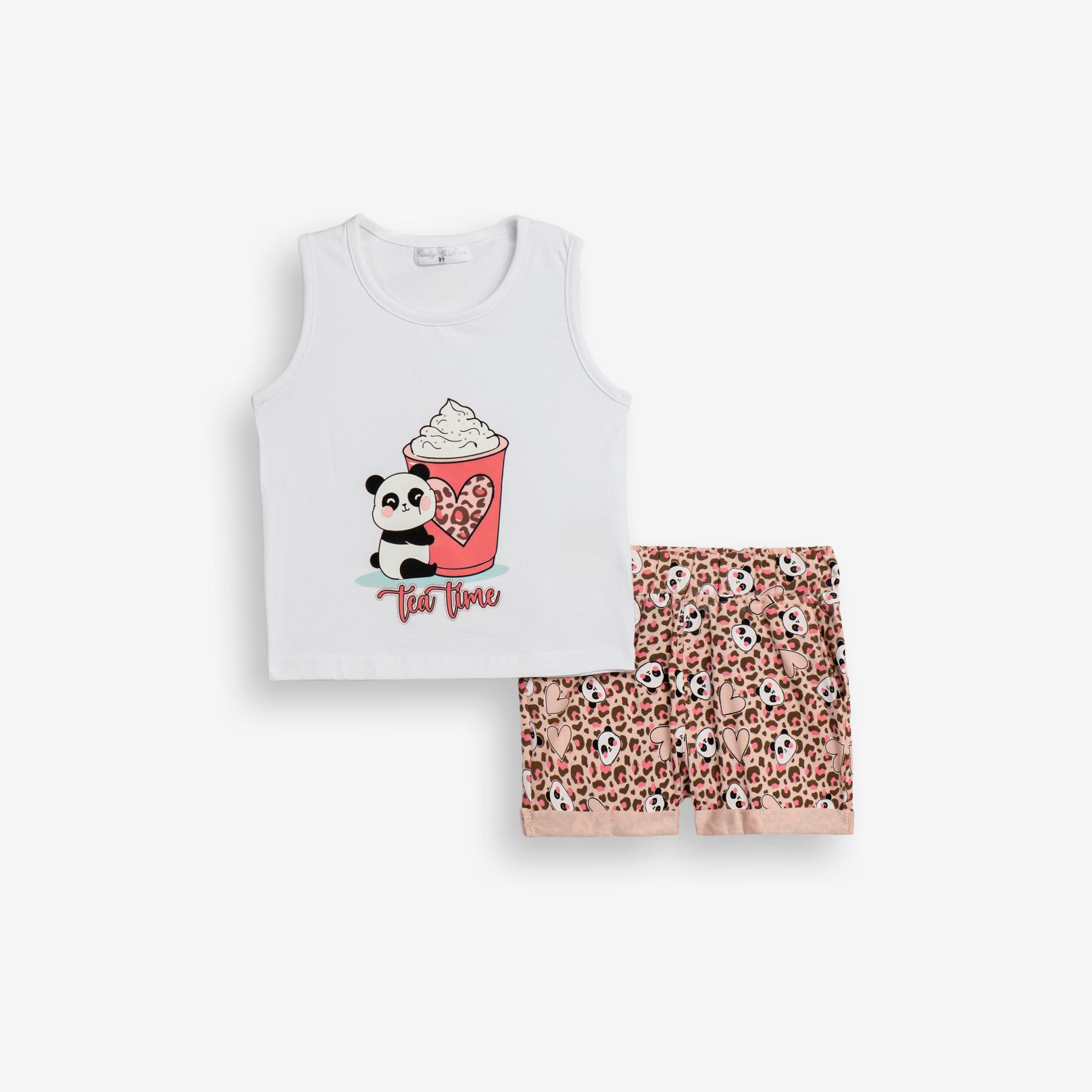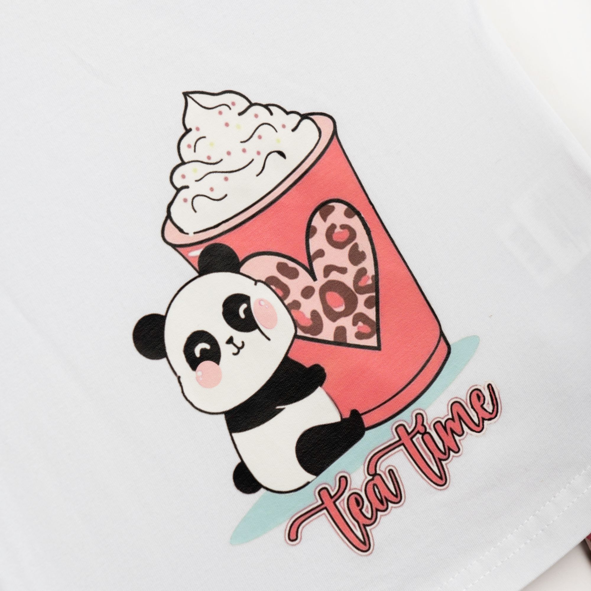 Σετ μπλούζα καλτσα λύκρα με τύπωμα (tea time) και σόρτς με τύπωμα allover σε χρώμα λευκό/ροζ πούδρας για κορίτσι 1-6 ετών