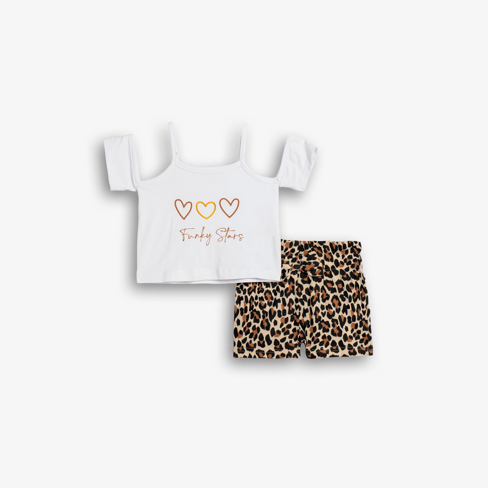 Σετ μπλούζα καλτσα λύκρα με τύπωμα (funky stars) και σόρτς βισκόζ allover σε χρώμα λευκό/ανοιχτό μπέζ για κορίτσι 1-6 ετών