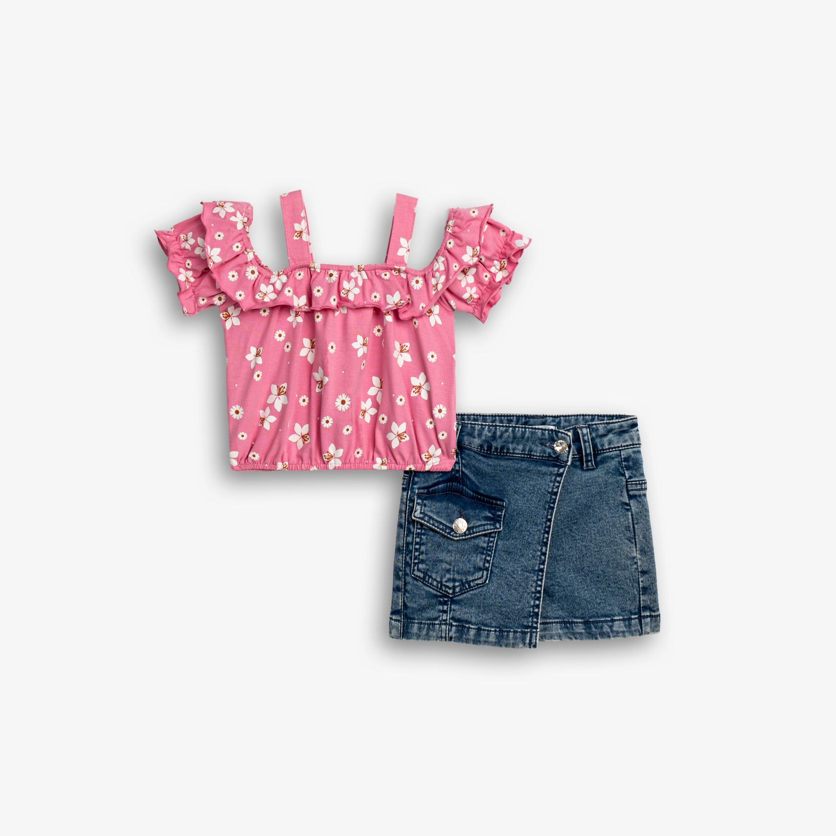 Σετ μπλούζα κάλτσα λύκρα με τύπωμα (λουλούδια) allover και σόρτς τζίν λύκρα σε χρώμα candy pink/μπλέ τζίν για κορίτσι 1-6 ετών