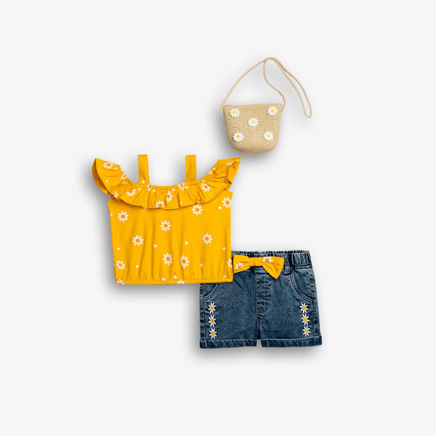 Σετ μπλούζα κάλτσα λύκρα με τύπωμα (λουλούδια) allover και σόρτς τζίν λύκρα σε χρώμα κροκί/μπλέ τζίν για κορίτσι 1-6 ετών