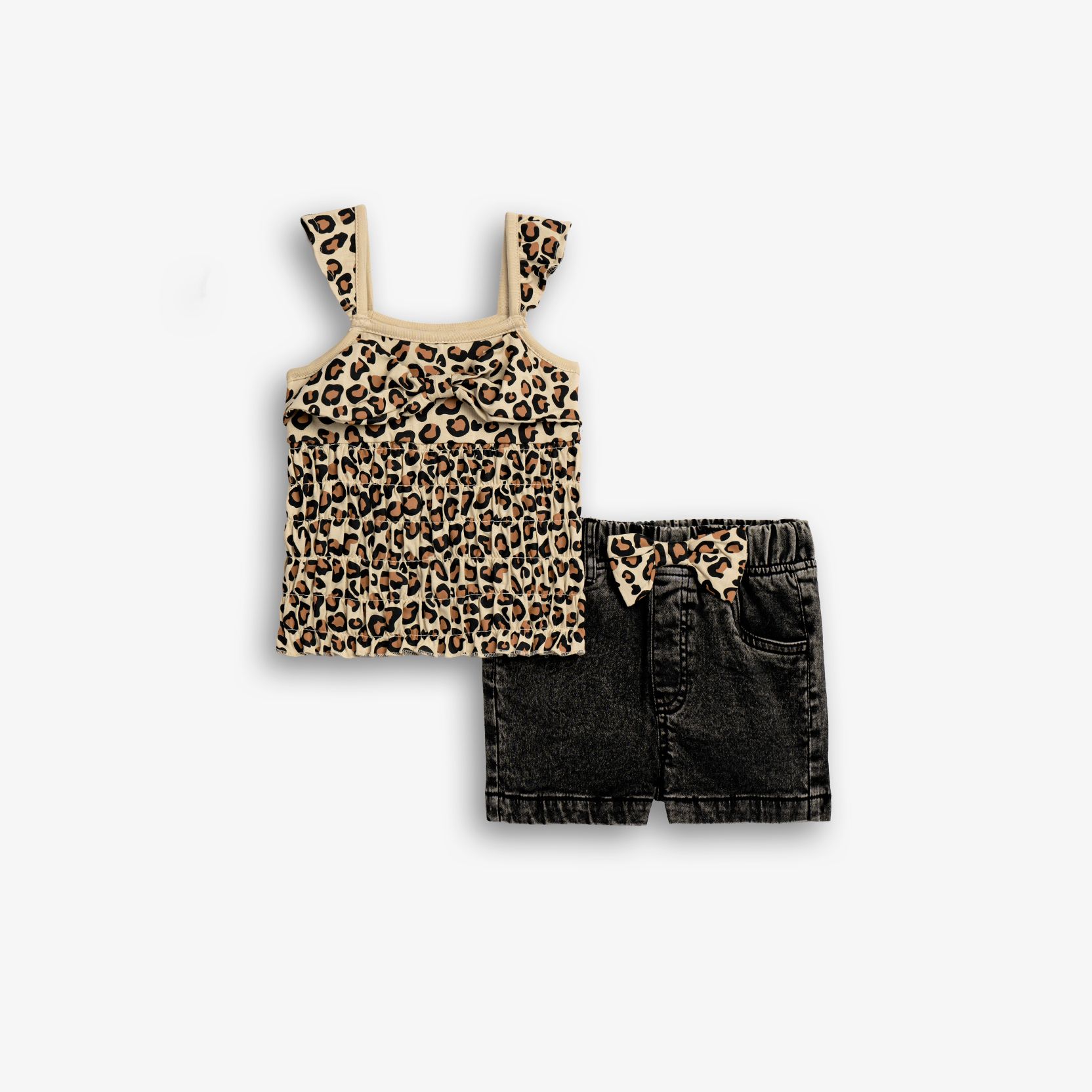 Σετ μπλούζα κάλτσα λύκρα με τύπωμα (λεοπάρ) allover και σόρτς τζίν λύκρα σε χρώμα μπέζ/μαύρο τζίν για κορίτσι 1-6 ετών