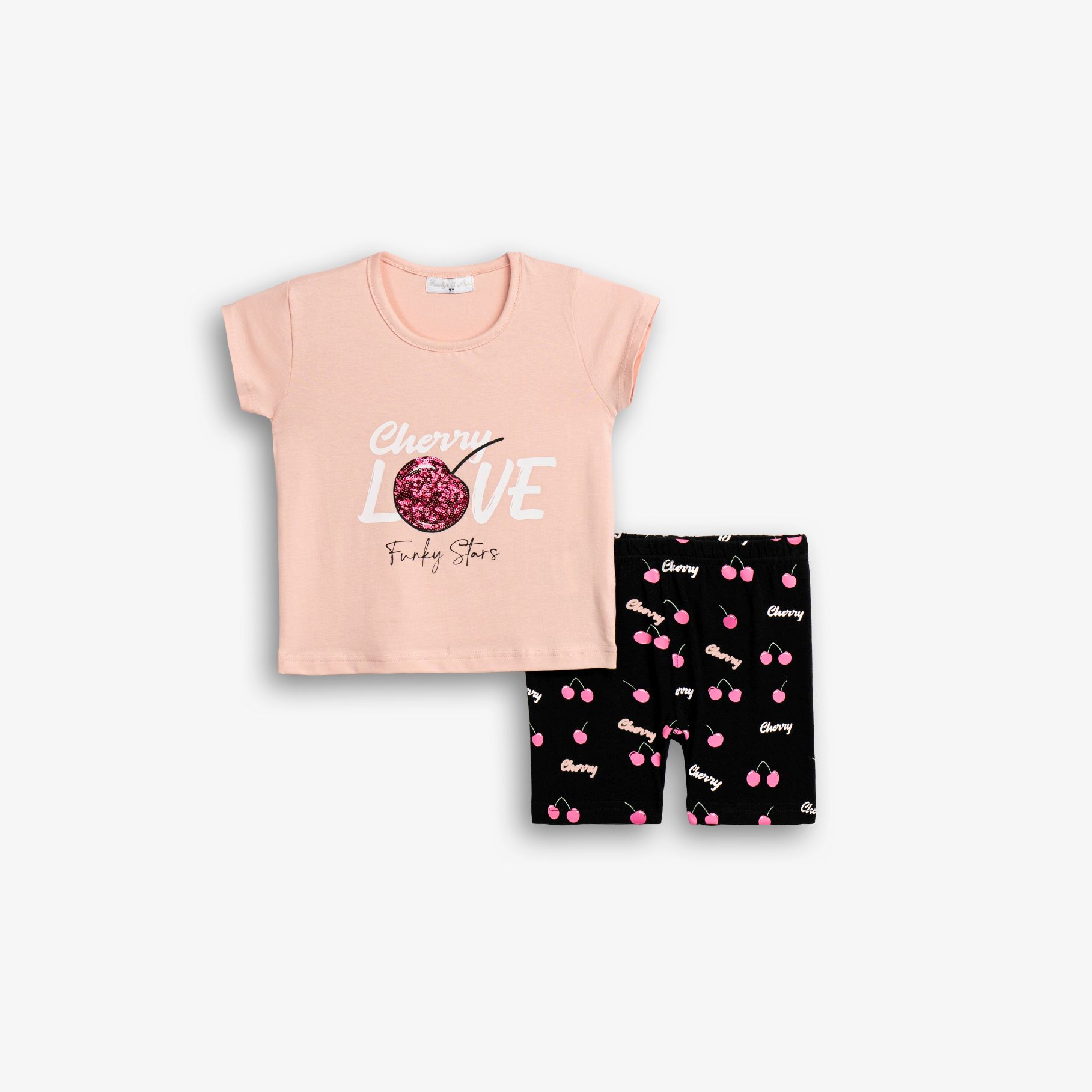 Σετ μπλούζα κάλτσα λύκρα με τύπωμα (κεράσι) και ποδηλατικό κολάν με τύπωμα allover σε χρώμα ροζ πούδρας/μαύρο για κορίτσι 1-6 ετών