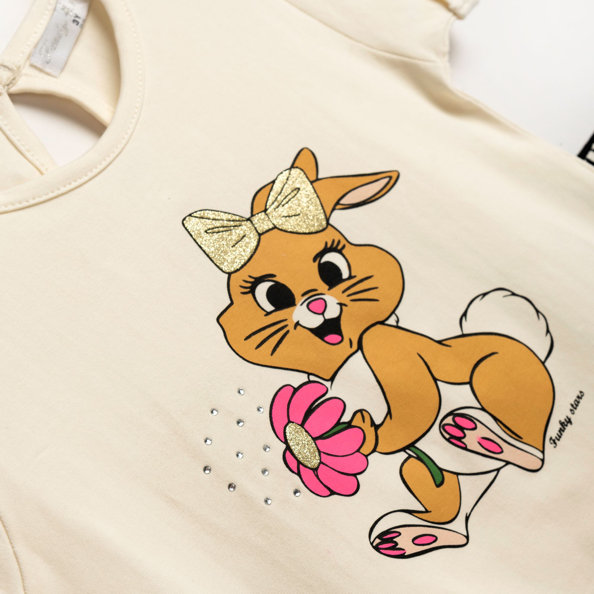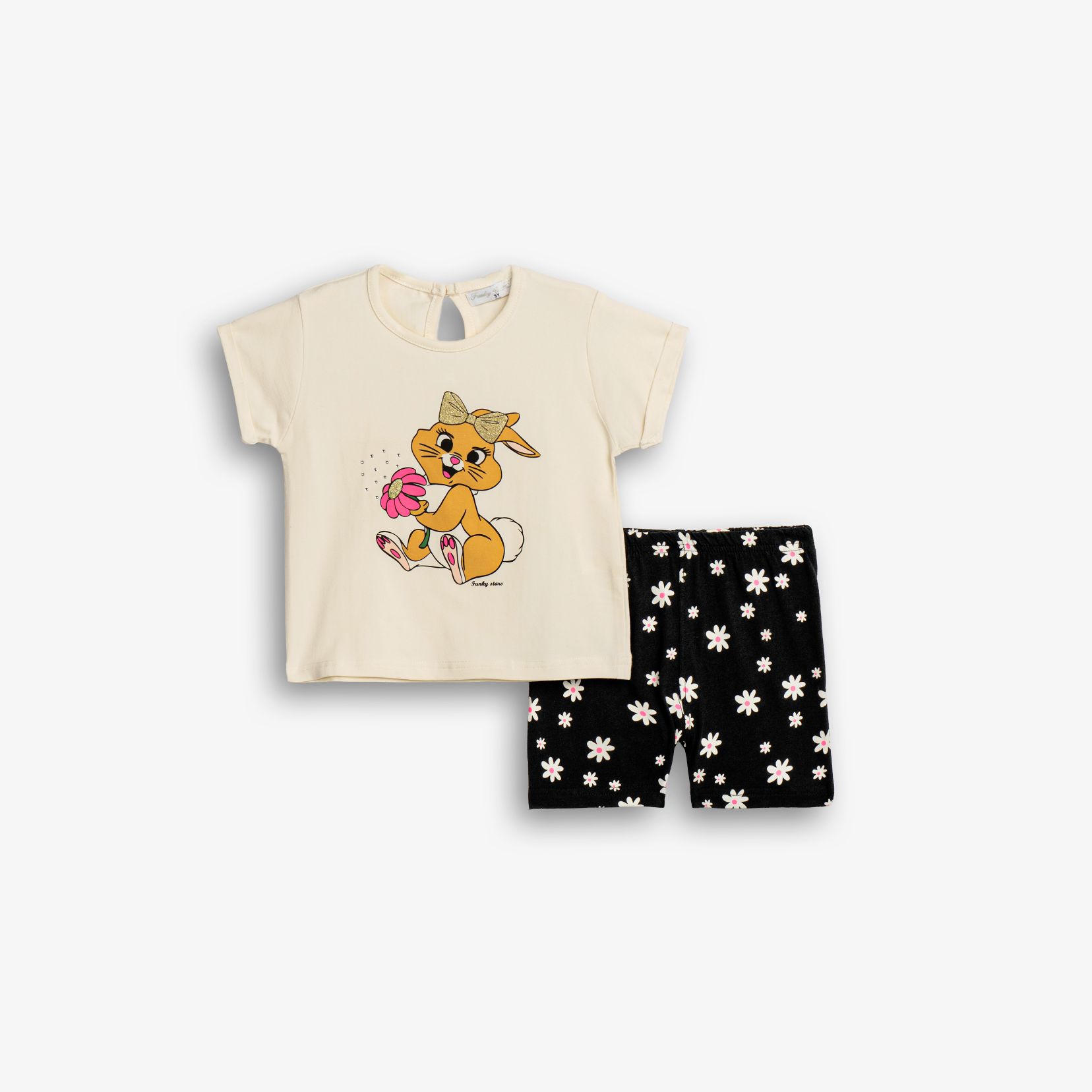 Σετ μπλούζα κάλτσα λύκρα με τύπωμα (κουνελάκι) και ποδηλατικό κολάν με τύπωμα allover σε χρώμα εκρού/μαύρο για κορίτσι 1-6 ετών