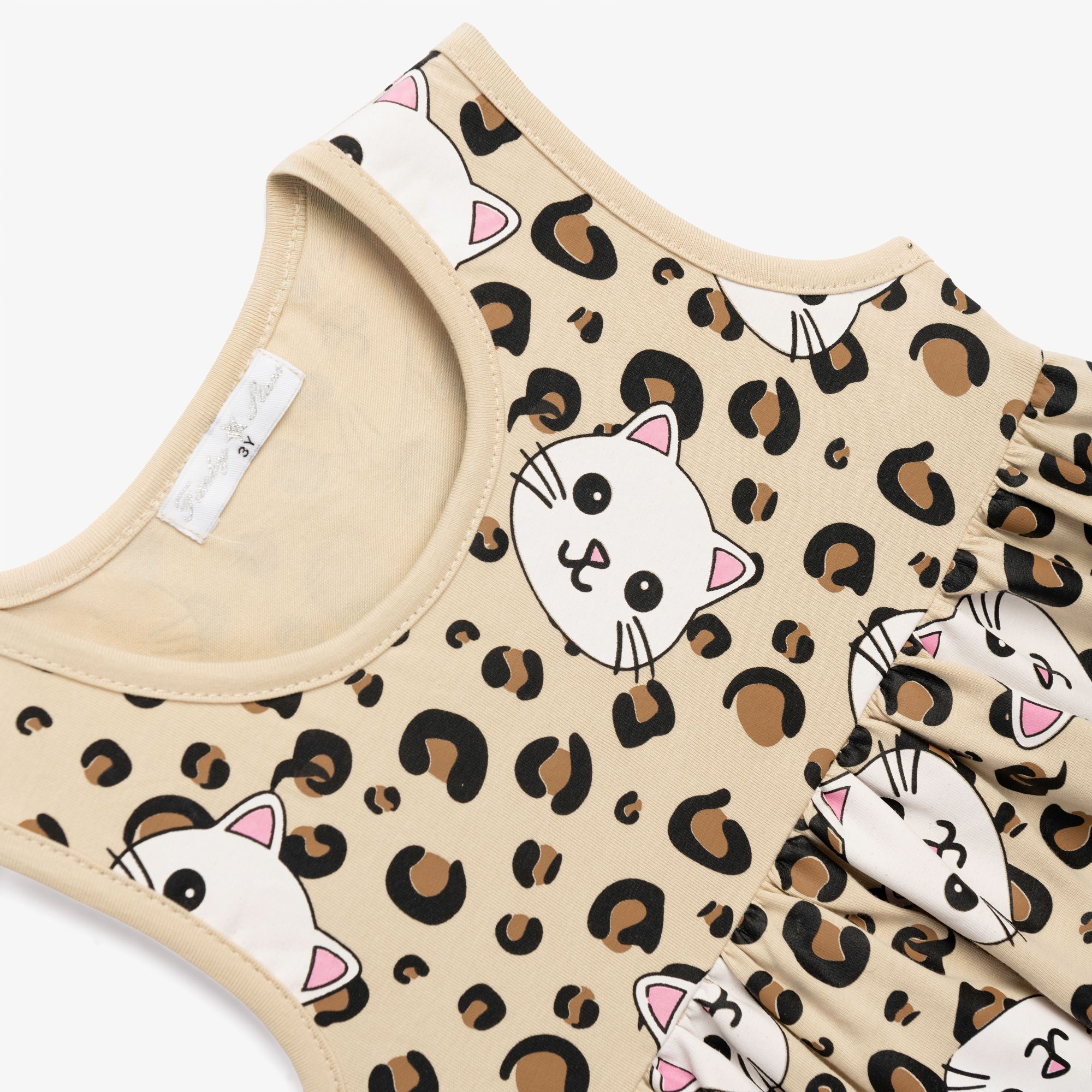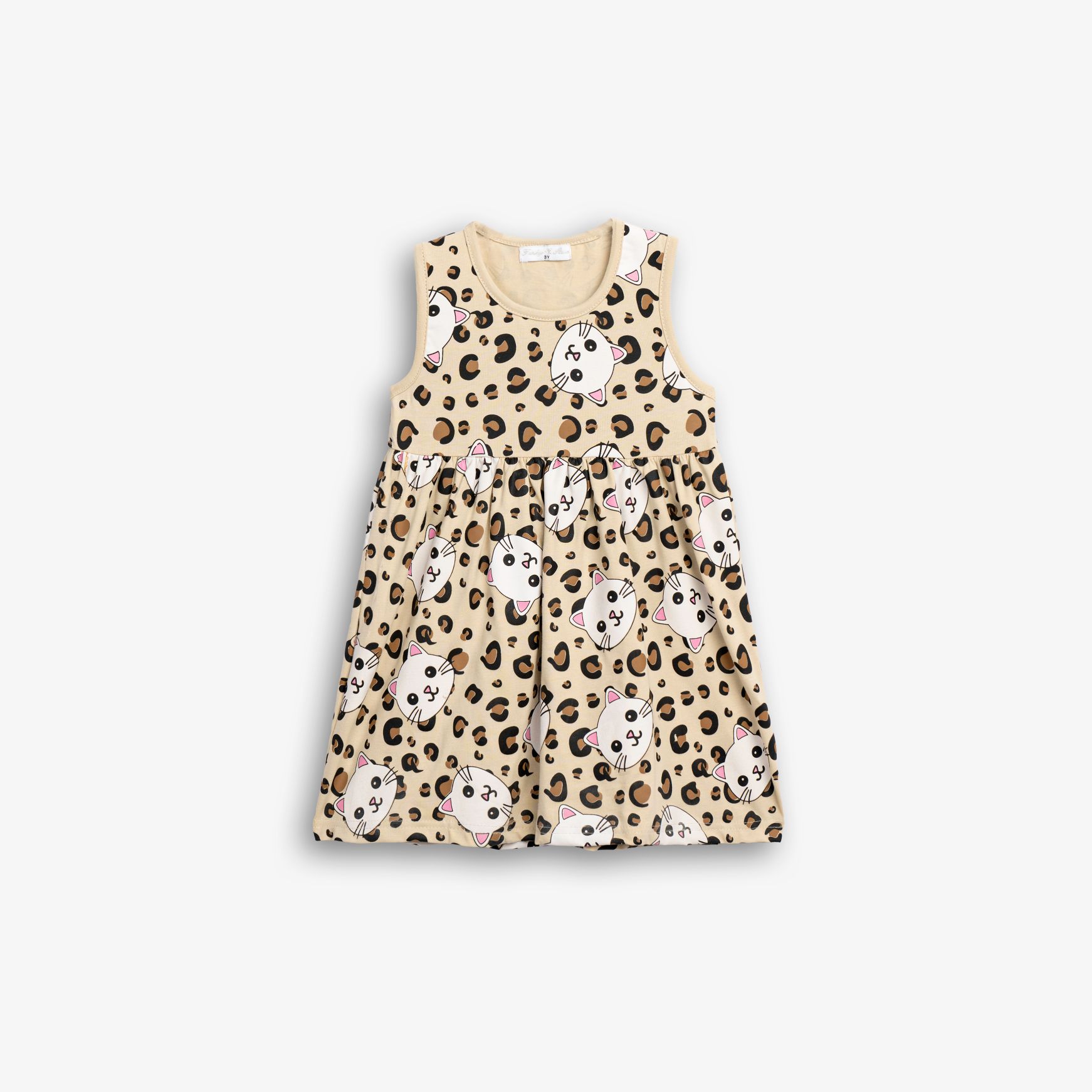 Φόρεμα κάλτσα λύκρα με τύπωμα (λεοπάρ και γάτες) allover σε χρώμα ανοιχτό μπέζ για κορίτσι 1-6 ετών