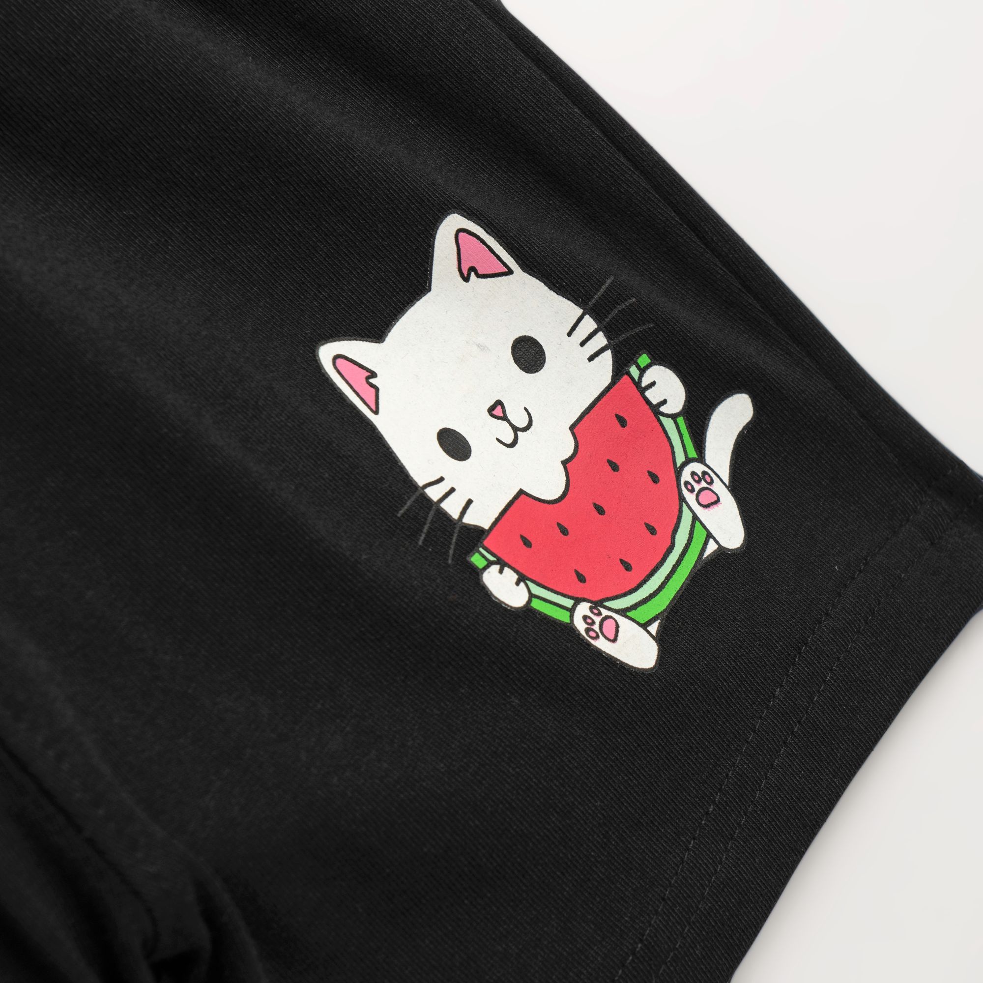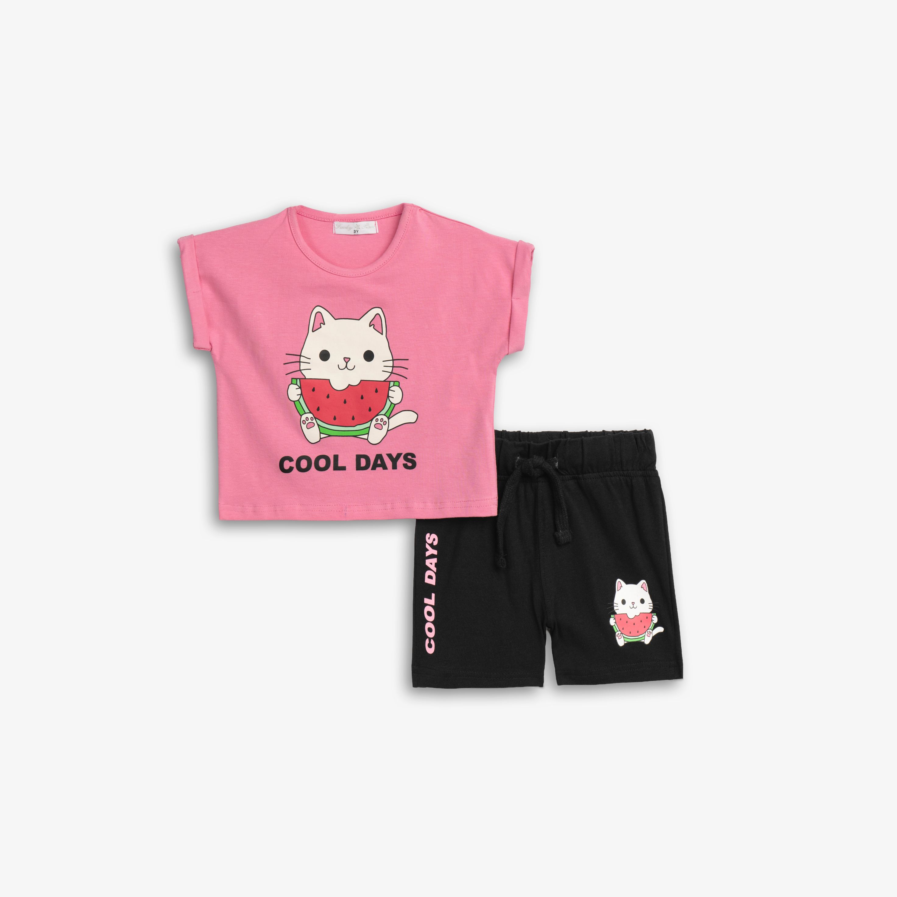 Σετ μπλούζα κάλτσα λύκρα με τύπωμα (γατούλα) και βερμούδα με τύπωμα σε χρώμα candy pink/μαύρο για κορίτσι 1-6 ετών