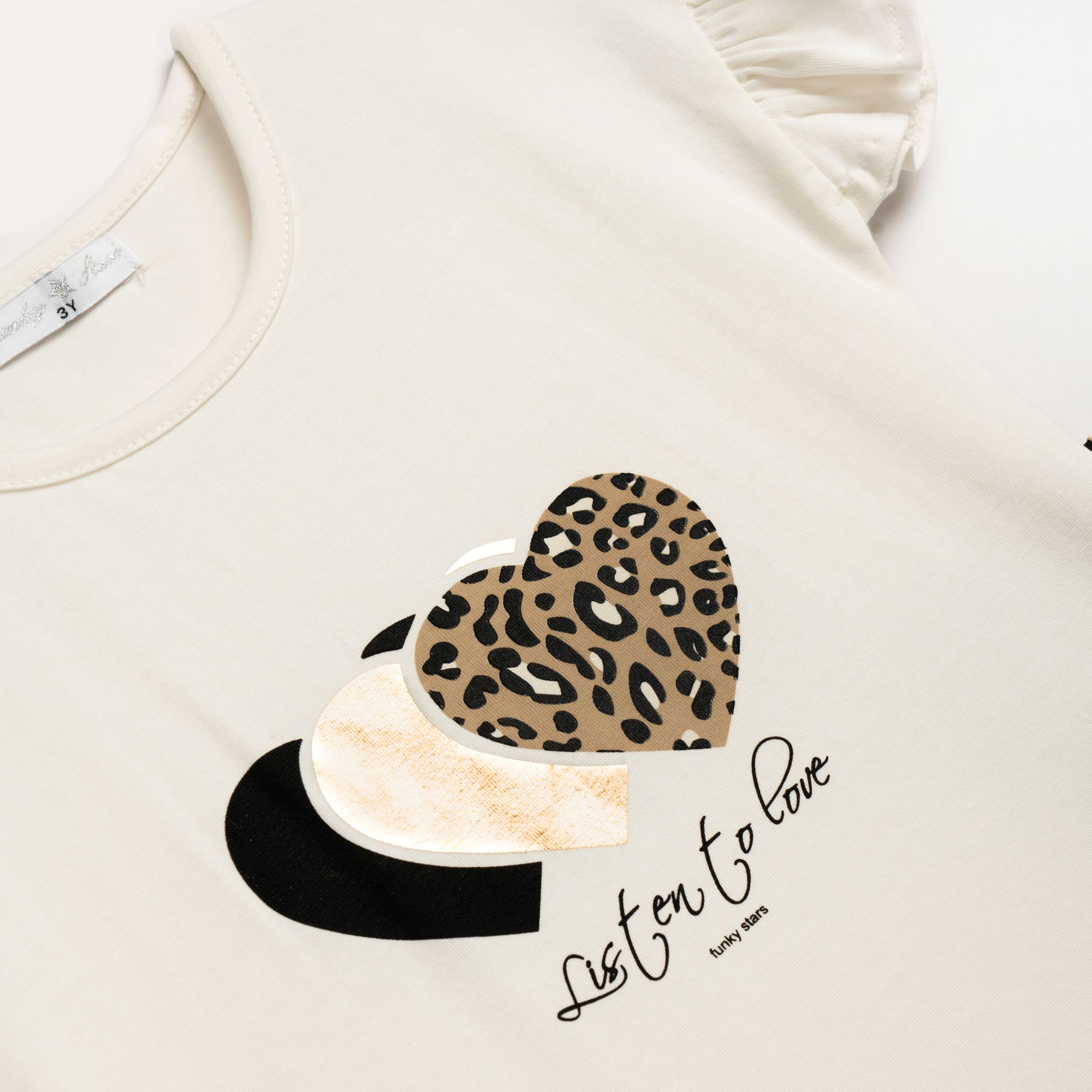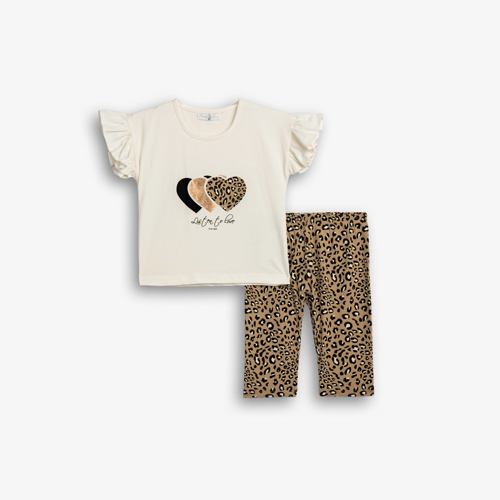 Σετ μπλούζα με τύπωμα (καρδιές) και κολάν κάπρι κάλτσα με τύπωμα allover σε χρώμα εκρού/μόκα για κορίτσι 1-6 ετών