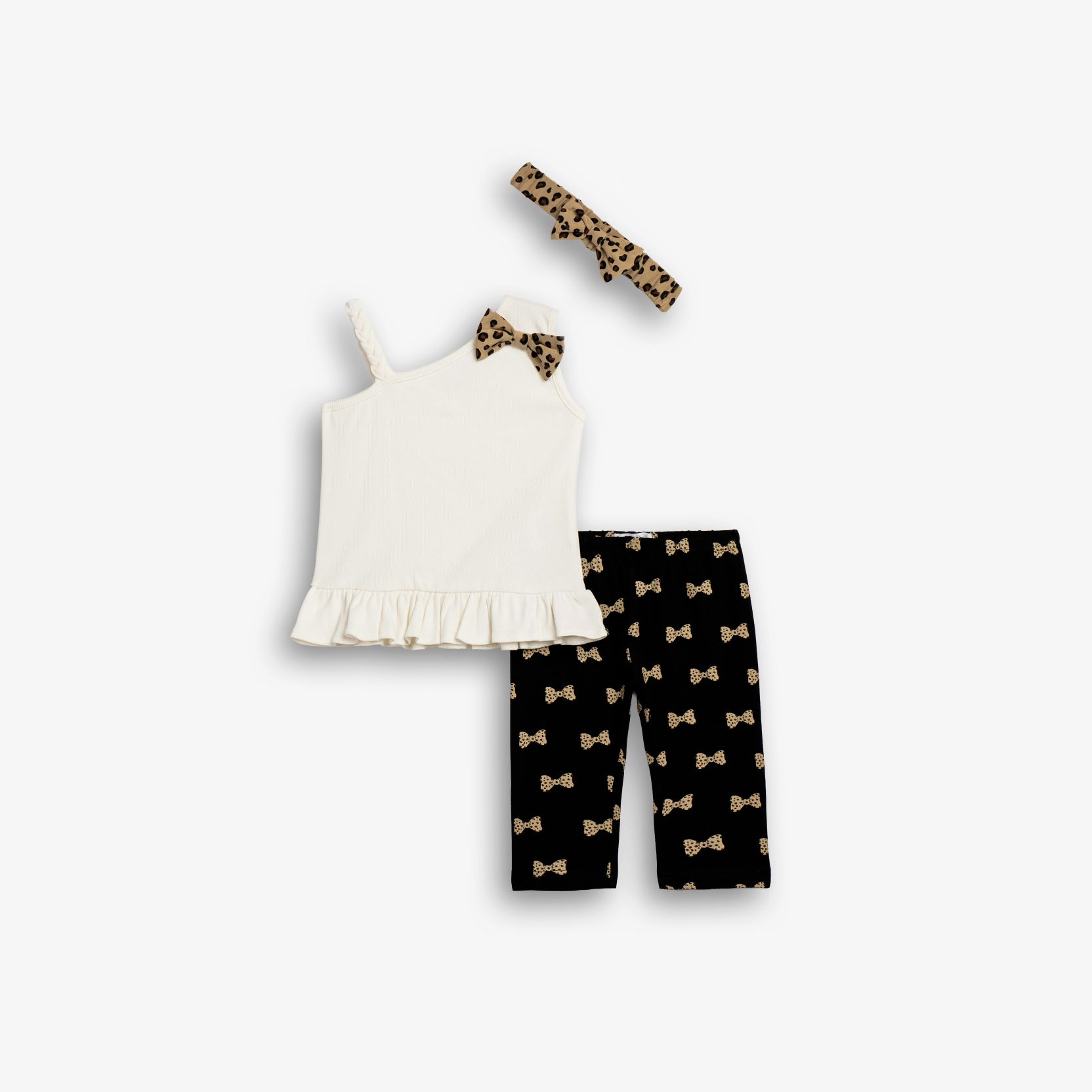 Σετ μπλούζα και κολάν κάπρι με τύπωμα allover και κορδέλα σε χρώμα εκρού-μόκα/μαύρο για κορίτσι 1-6 ετών