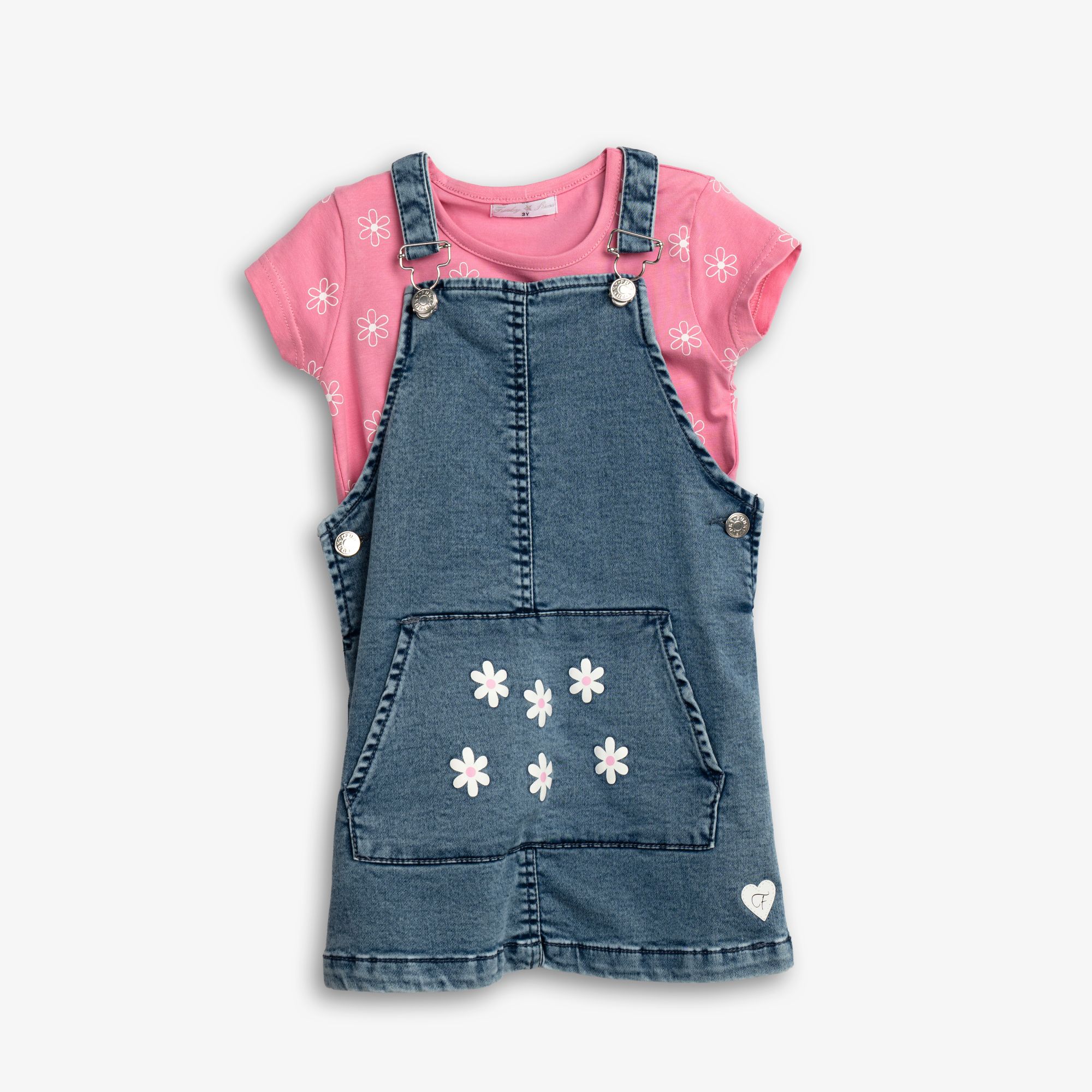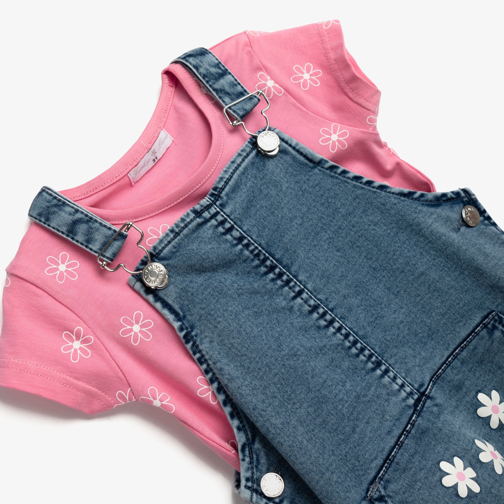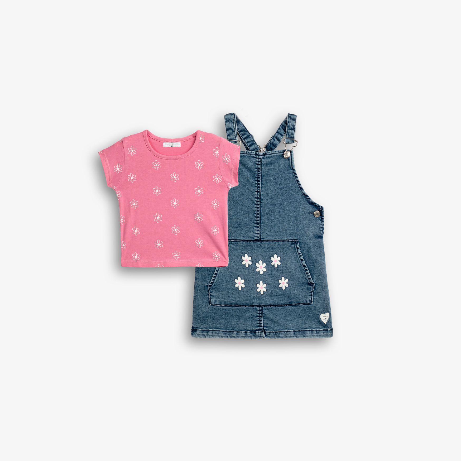 Σετ μπλούζα με τύπωμα (λουλούδια) allover με σαλοφούστα τζίν λύκρα με τύπωμα σε χρώμα candy pink/τύπος για κορίτσι 1-6 ετών