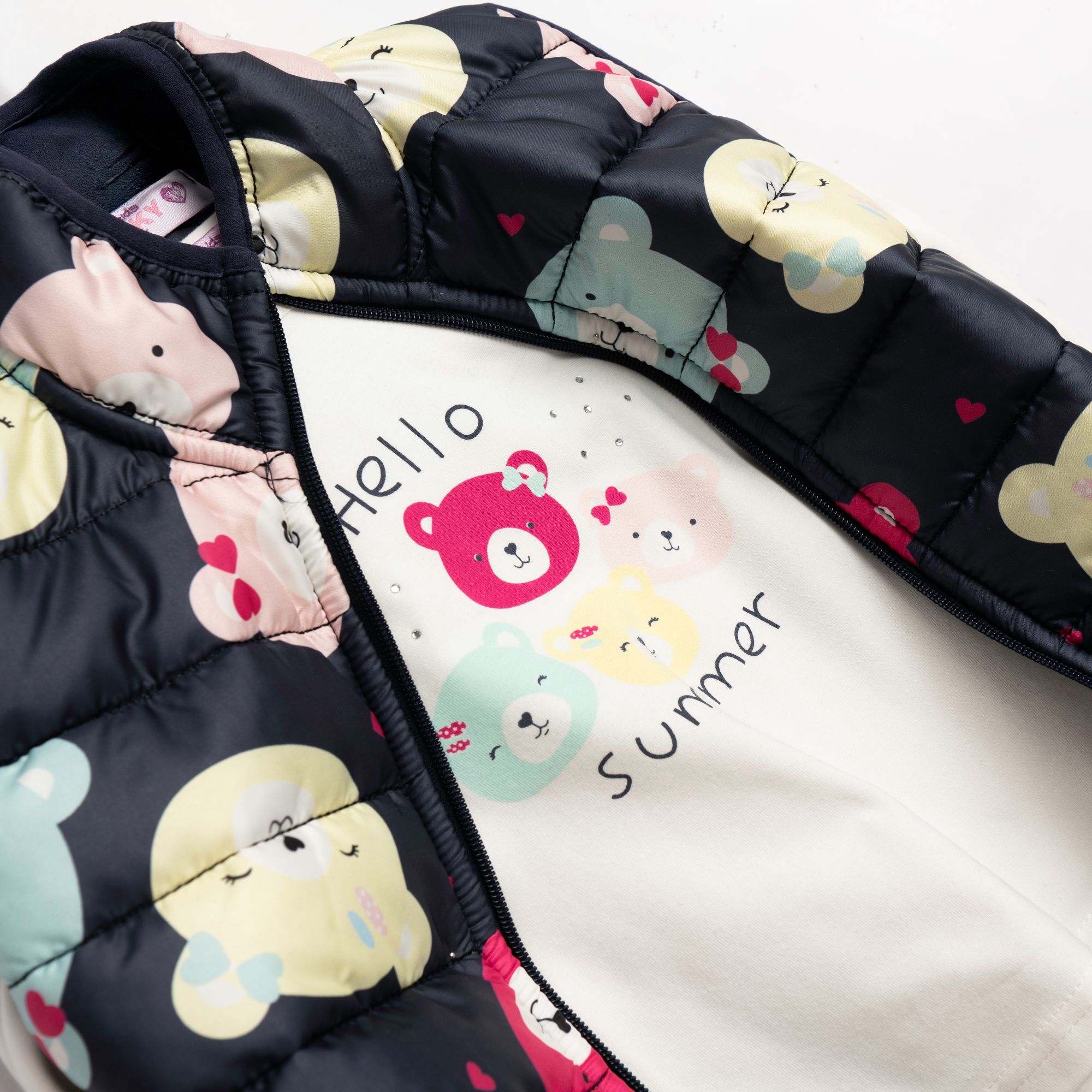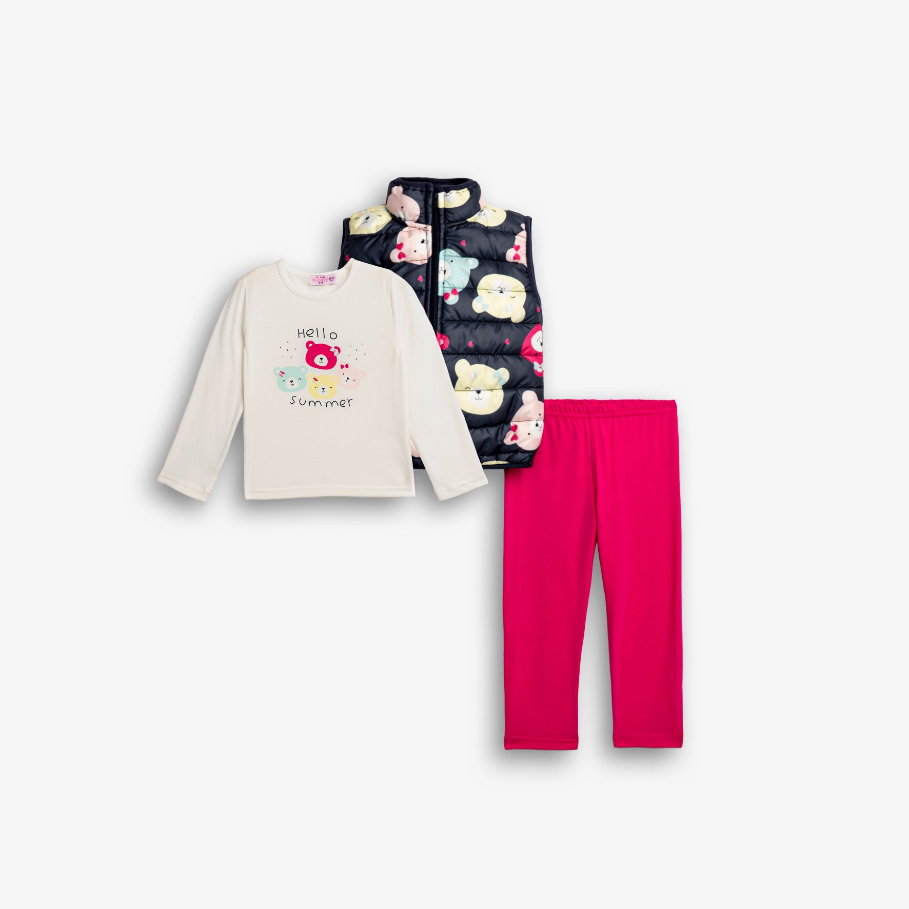 Σετ τζάκετ αμάνικο με τύπωμα (αρκουδάκια) allover και μπλούζα μακρυμάνικη κάλτσα με τύπωμα και κολάν μακρύ κάλτσα λύκρα σε χρώμα μπλέ/εκρού/φούξ για κορίτσι 1-6 ετών