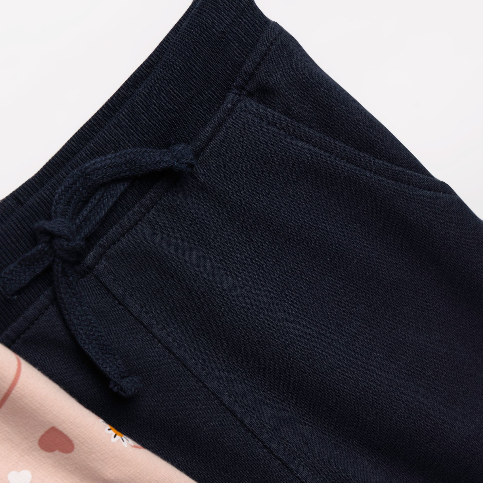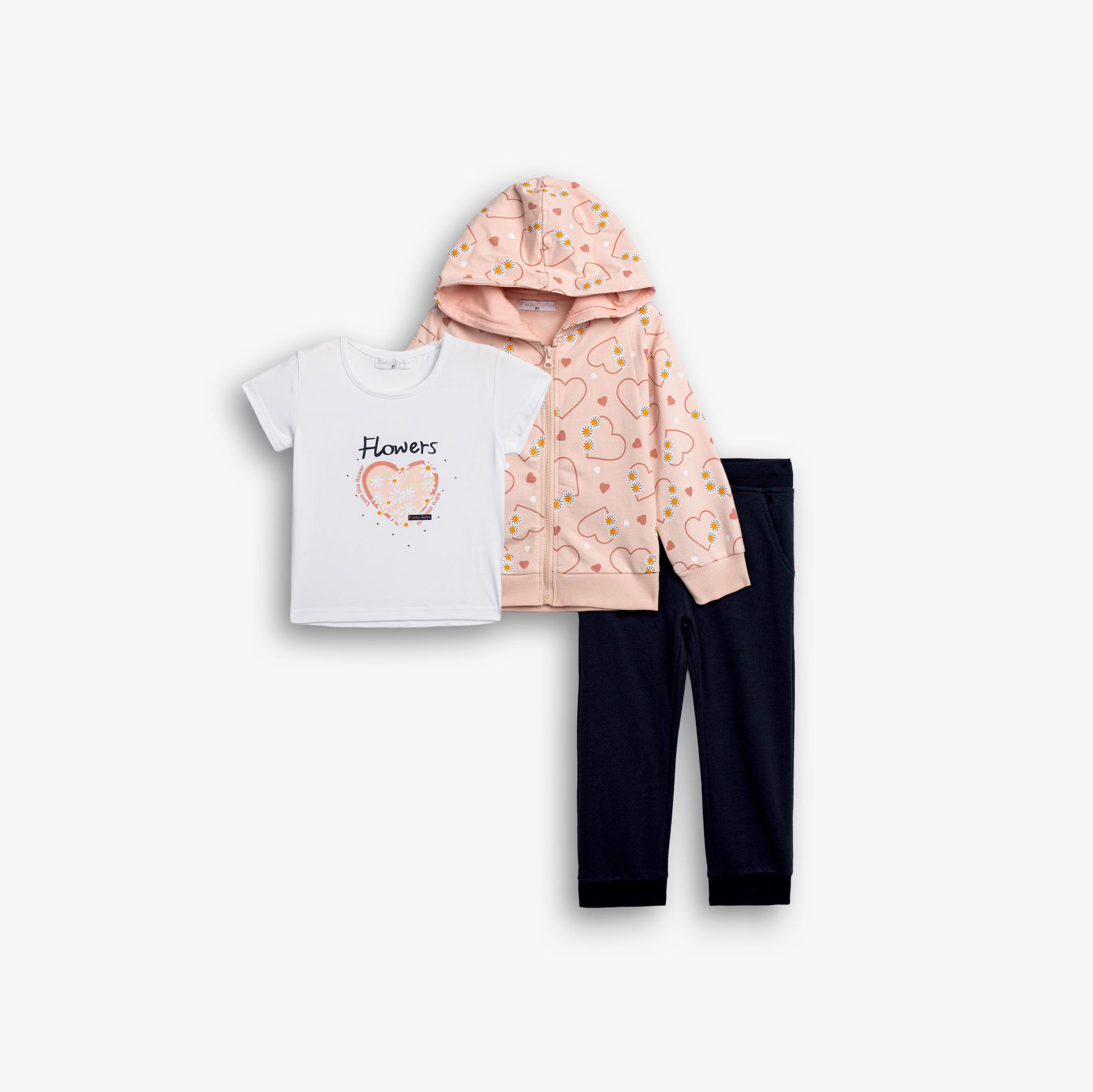 Σετ ζακέτα μακρυαμάνικη φούτερ με τύπωμα (καρδιές και χαμομήλι) allover και μπλούζα κοντομάνικη κάλτσα με τύπωμα και παντελόνι φούτερ σε χρώμα ροζ πούδρας/λευκό/μπλέ για κορίτσι 1-6 ετών