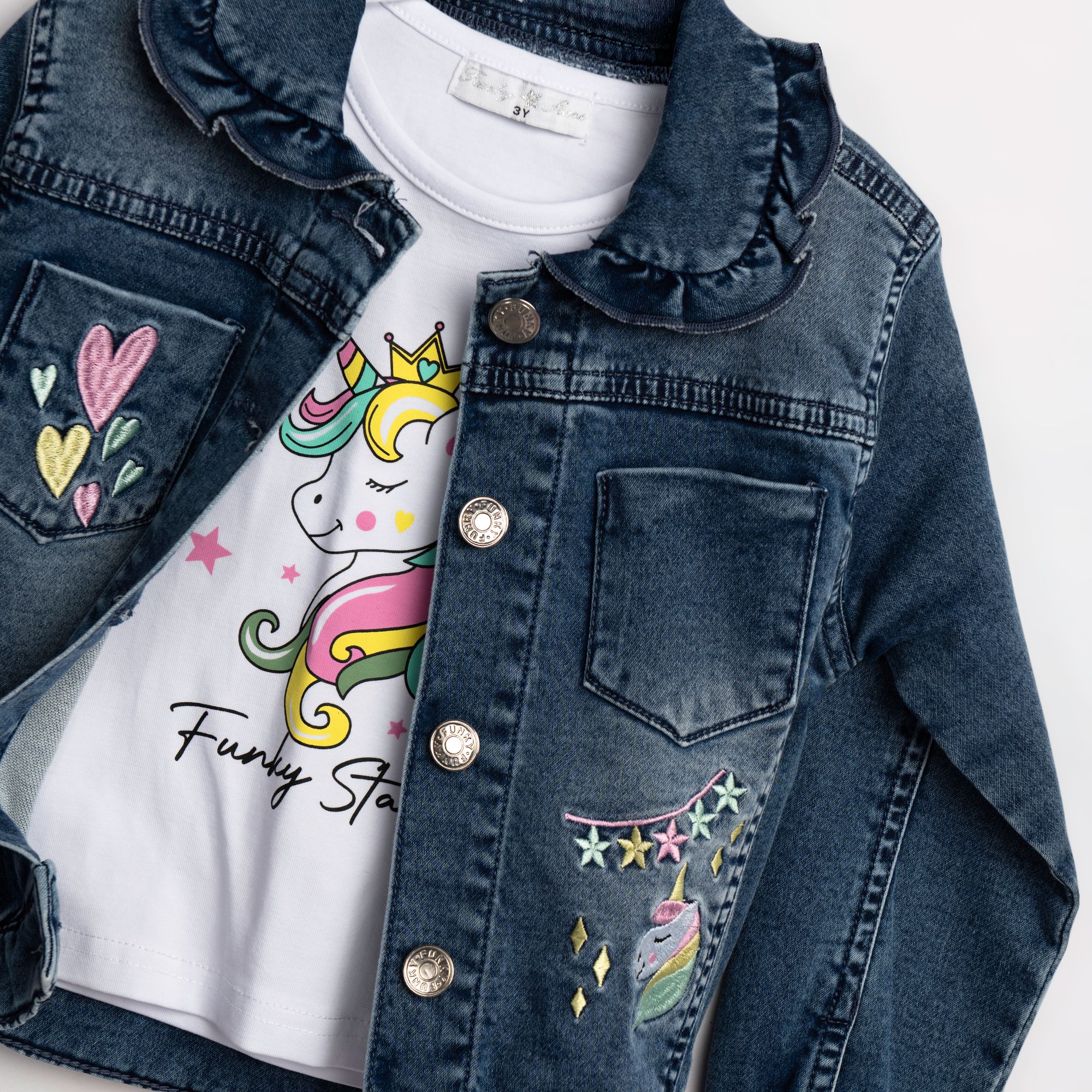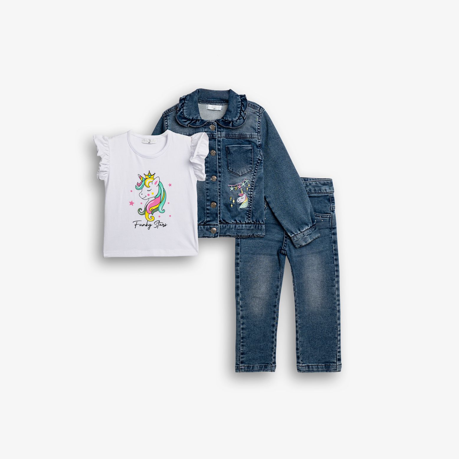 Σετ τζάκετ τζίν λύκρα και μπλούζα αμάνικη λύκρα κάλτσα με τύπωμα (μονόκερο) και παντελόνι τζίν λύκρα σε χρώμα τύπος/λευκό/τύπος για κορίτσι 1-6 ετών