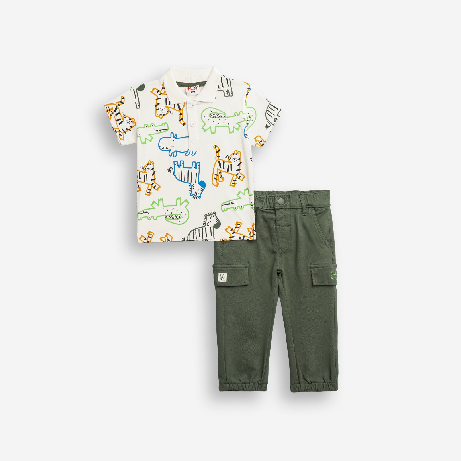 Σετ μπλούζα κοντομάνικη πόλο κάλτσα με τύπωμα (ζωάκια) και παντελόνι λύκρα σε χρώμα εκρού/χακί για αγόρι μηνών