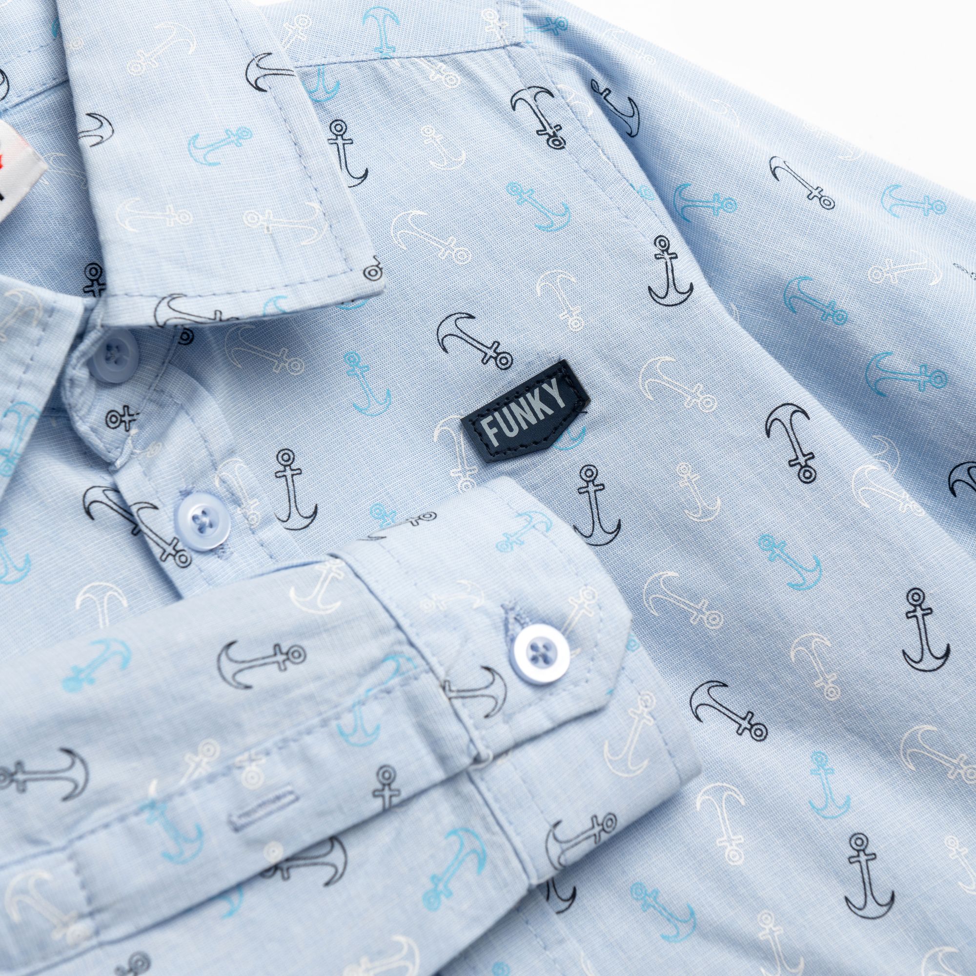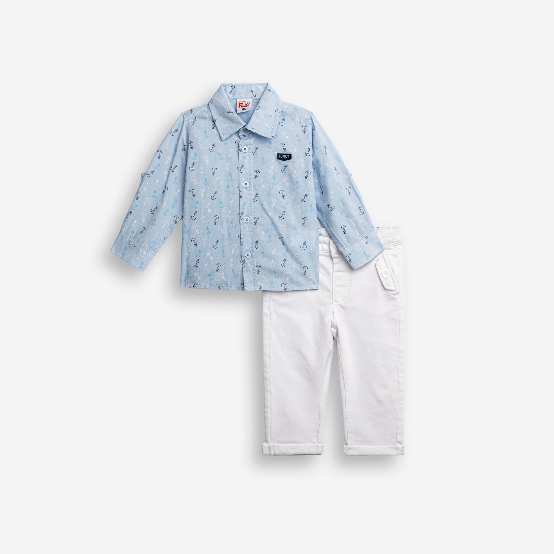 Σετ πουκάμισο μακρυμάνικο με τύπωμα (άγκυρες) allover και παντελόνι λύκρα σε χρώμα ciel chambrey/λευκό για αγόρι μηνών