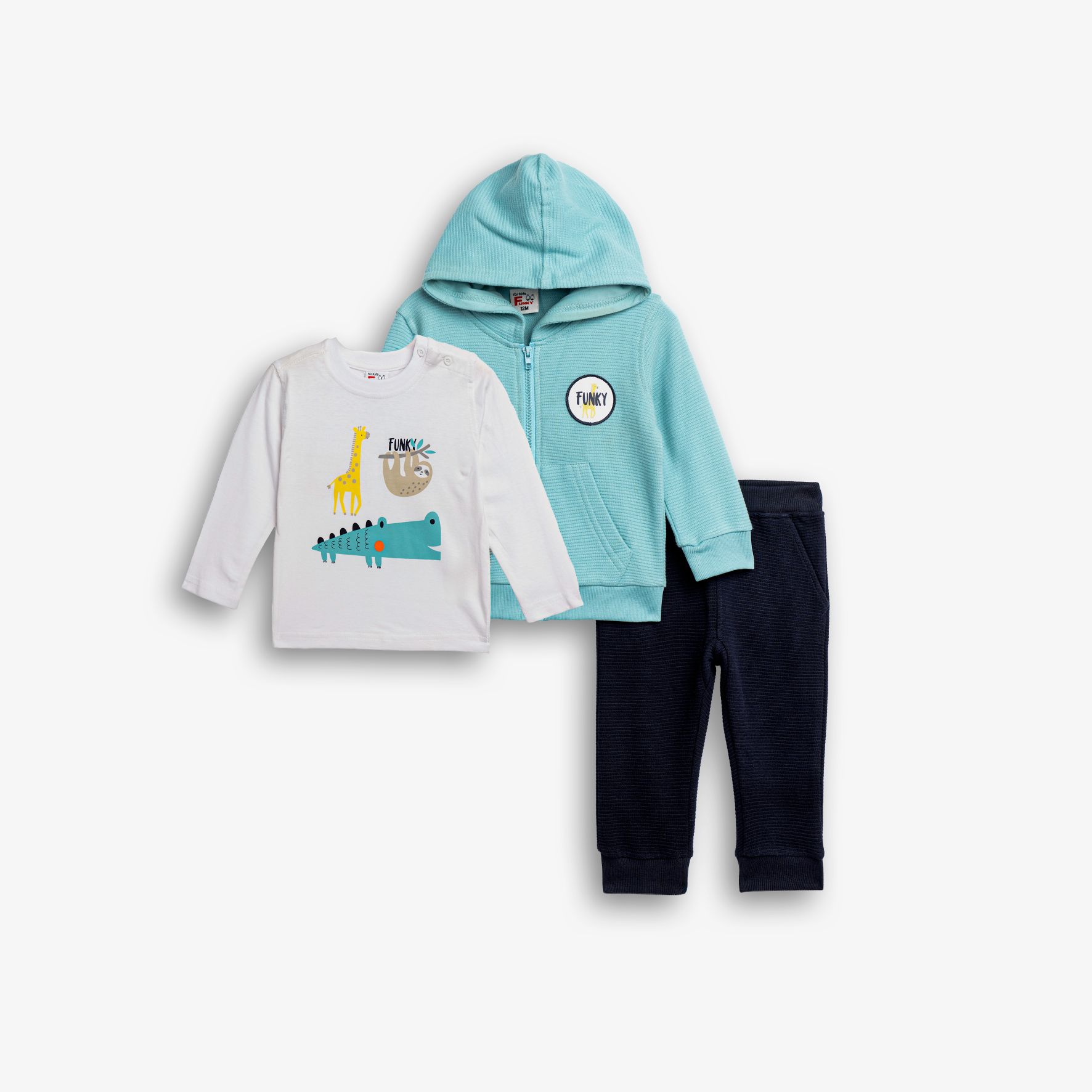 Σετ 3 τεμάχια ζακέτα μακρυμάνικη φούτερ και μπλούζα κοντομάνικη κάλτσα με τύπωμα (ζωάκια) και παντελόνι σε χρώμα diamond/λευκό/μπλε για αγόρι μηνών
