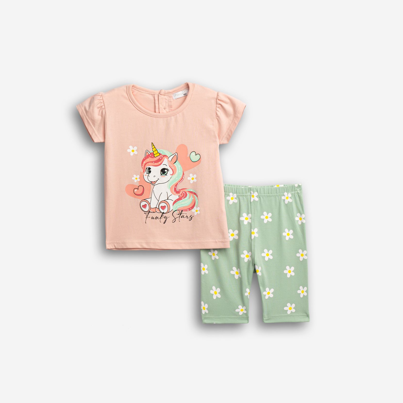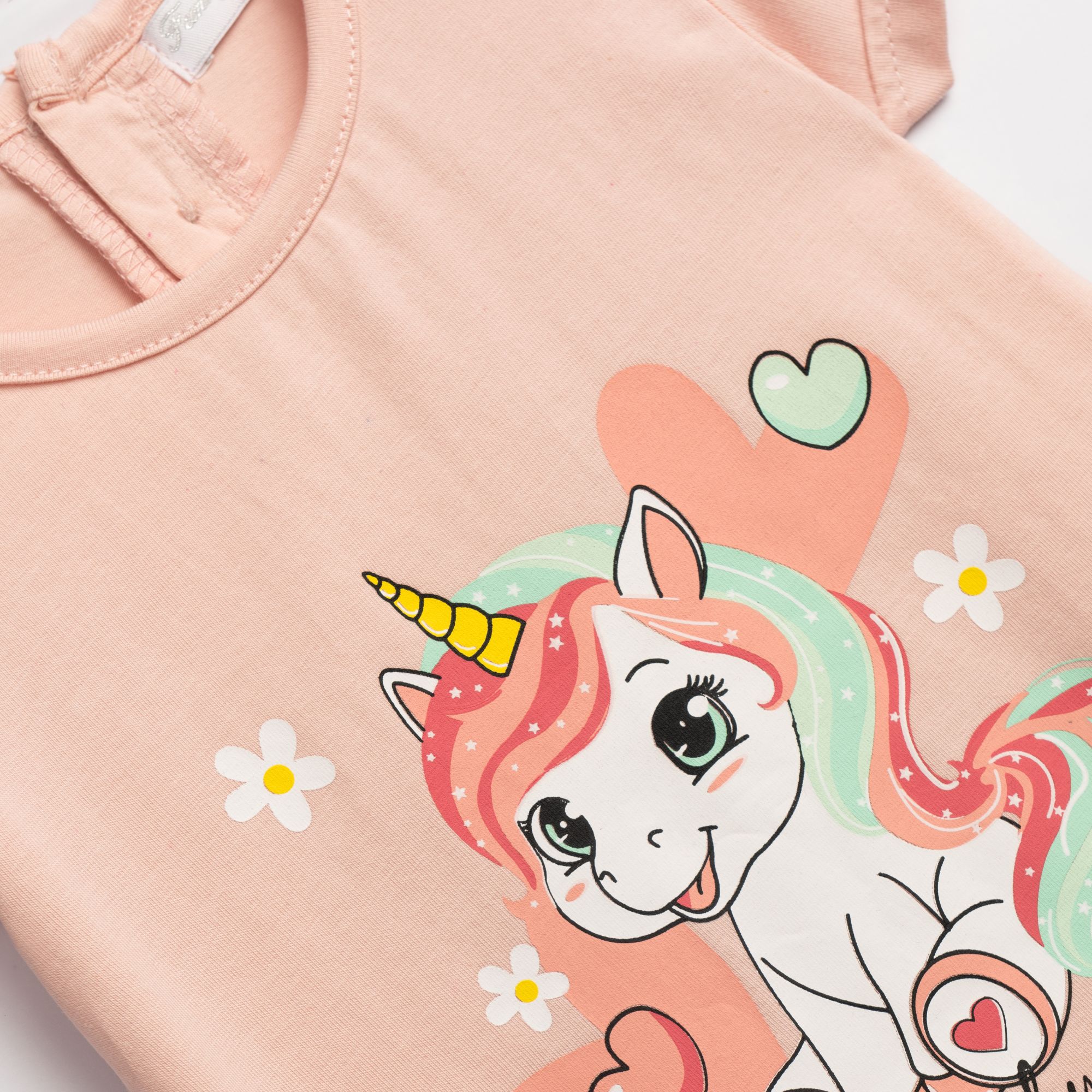 Μπλουζοφόρεμα κάλτσα λύκρα με τύπωμα (μονόκερος) και κολάν κάπρι με τύπωμα allover σε χρώμα ρόζ πούδρας/φυστικί για κορίτσι μηνών