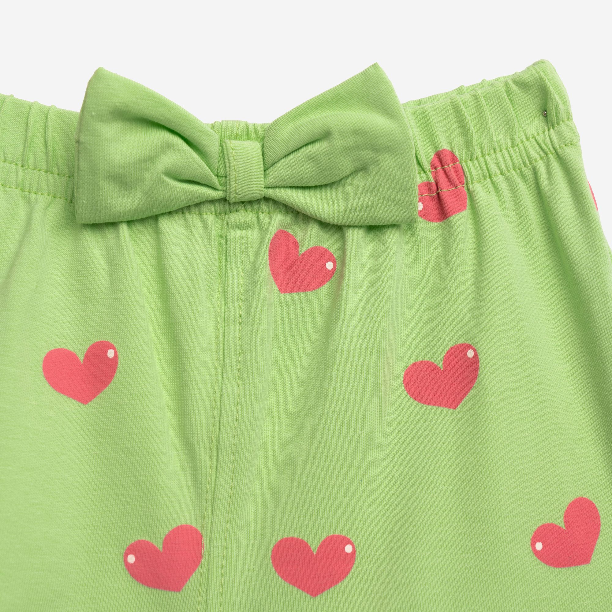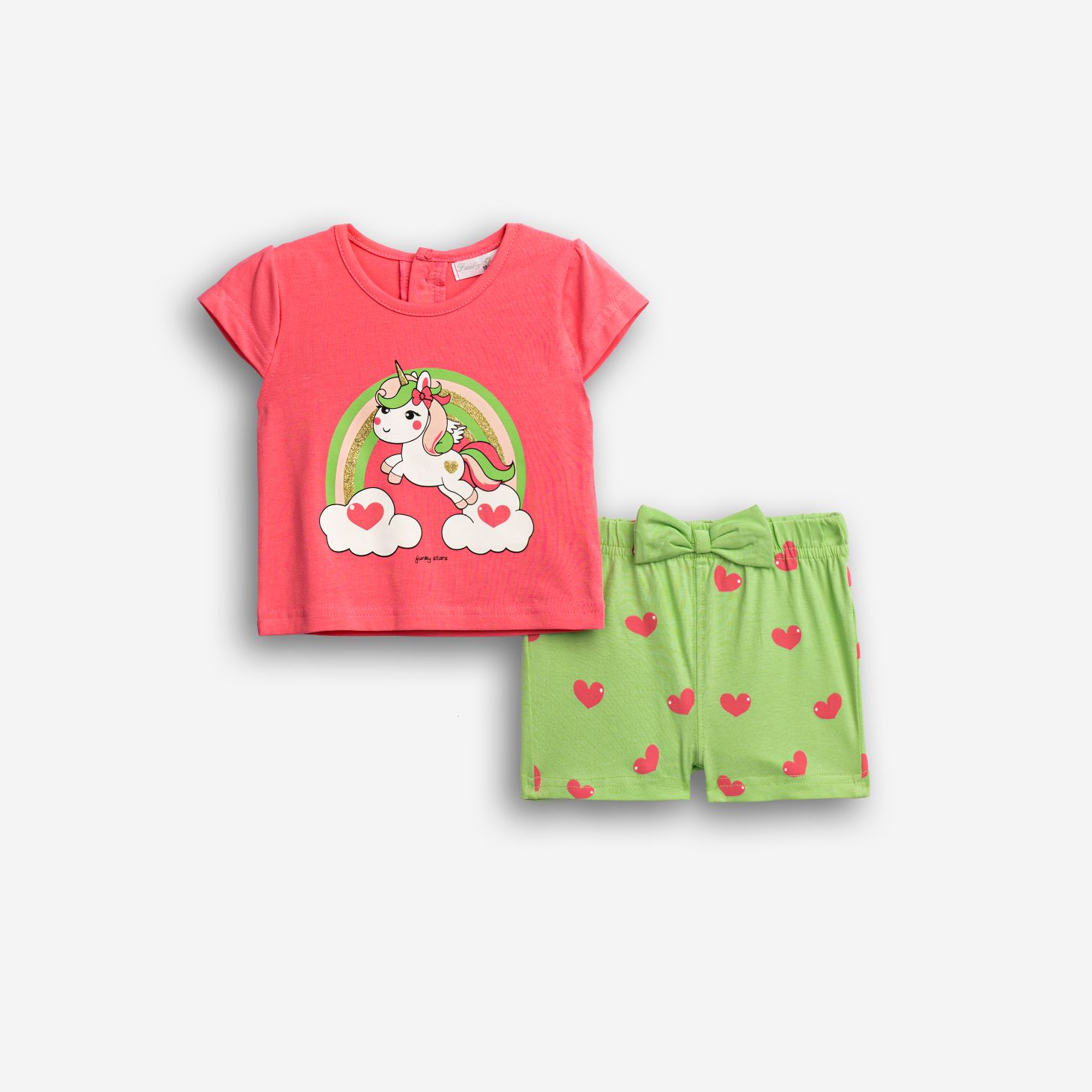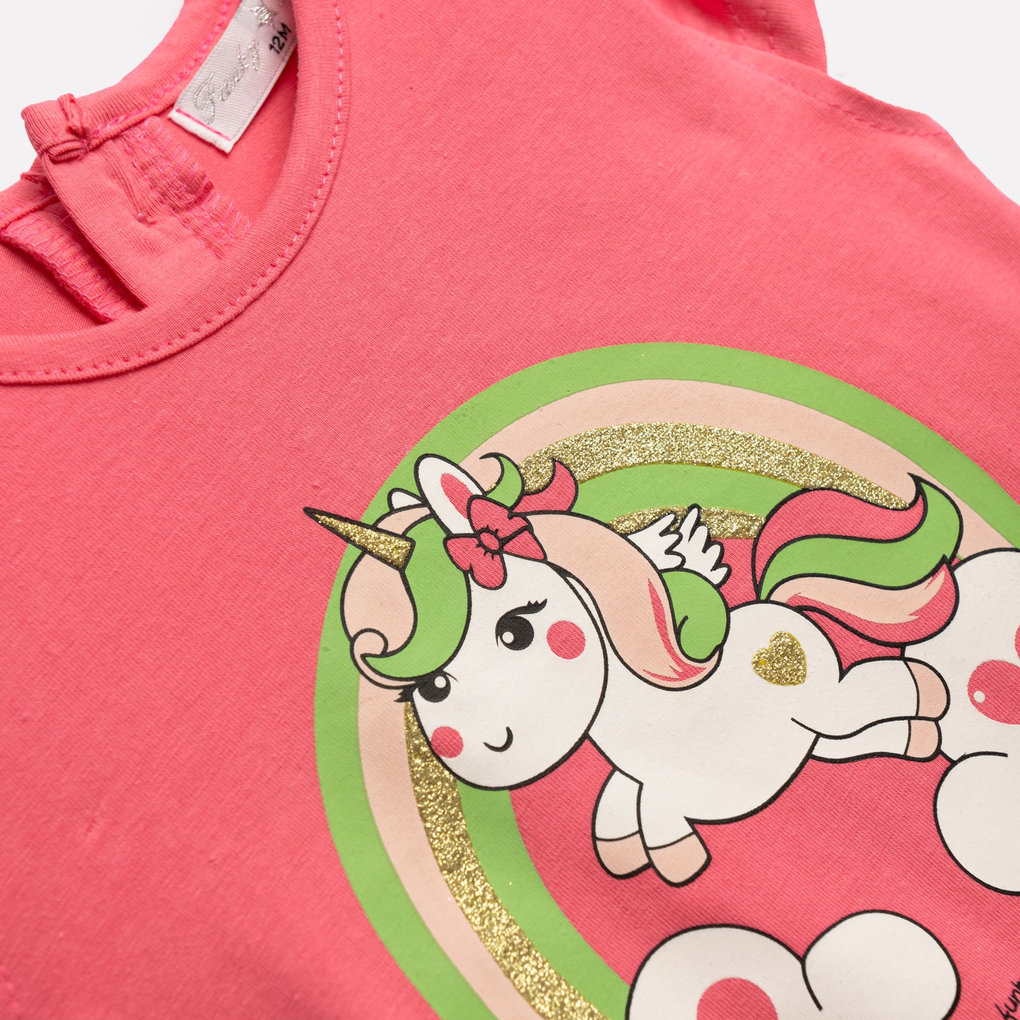Σετ μπλούζα κάλτσα λύκρα με τύπωμα (μονόκερος) και σόρτς με τύπωμα allover σε χρώμα φλαμίνγκο/paradise green για κορίτσι μηνών