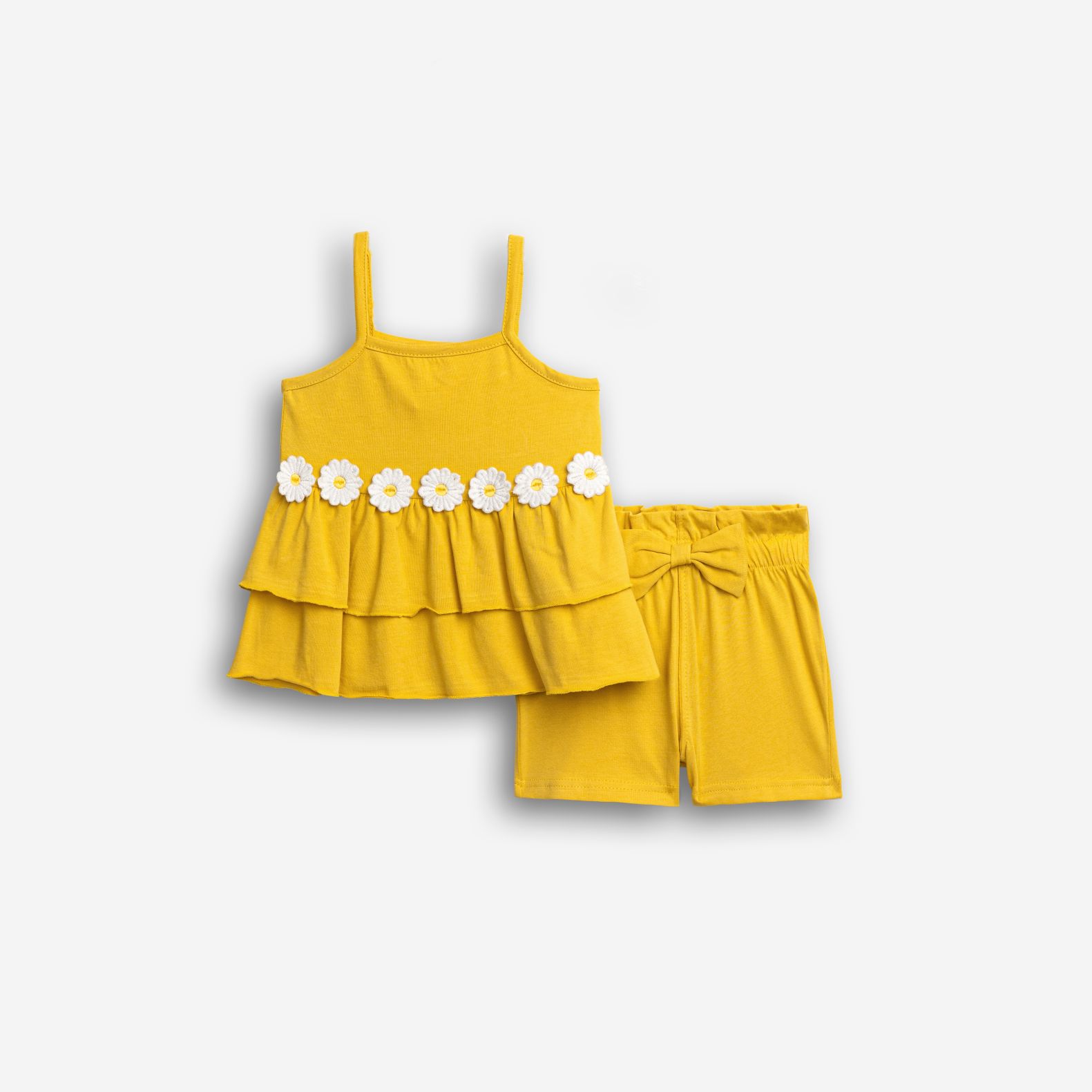 Σετ μπλούζα κάλτσα λύκρα με ανάγλυφο σχέδιο(χαμομήλι) και σόρτς σε χρώμα ηλιοτρόπιο/ηλιοτρόπιο για κορίτσι μηνών