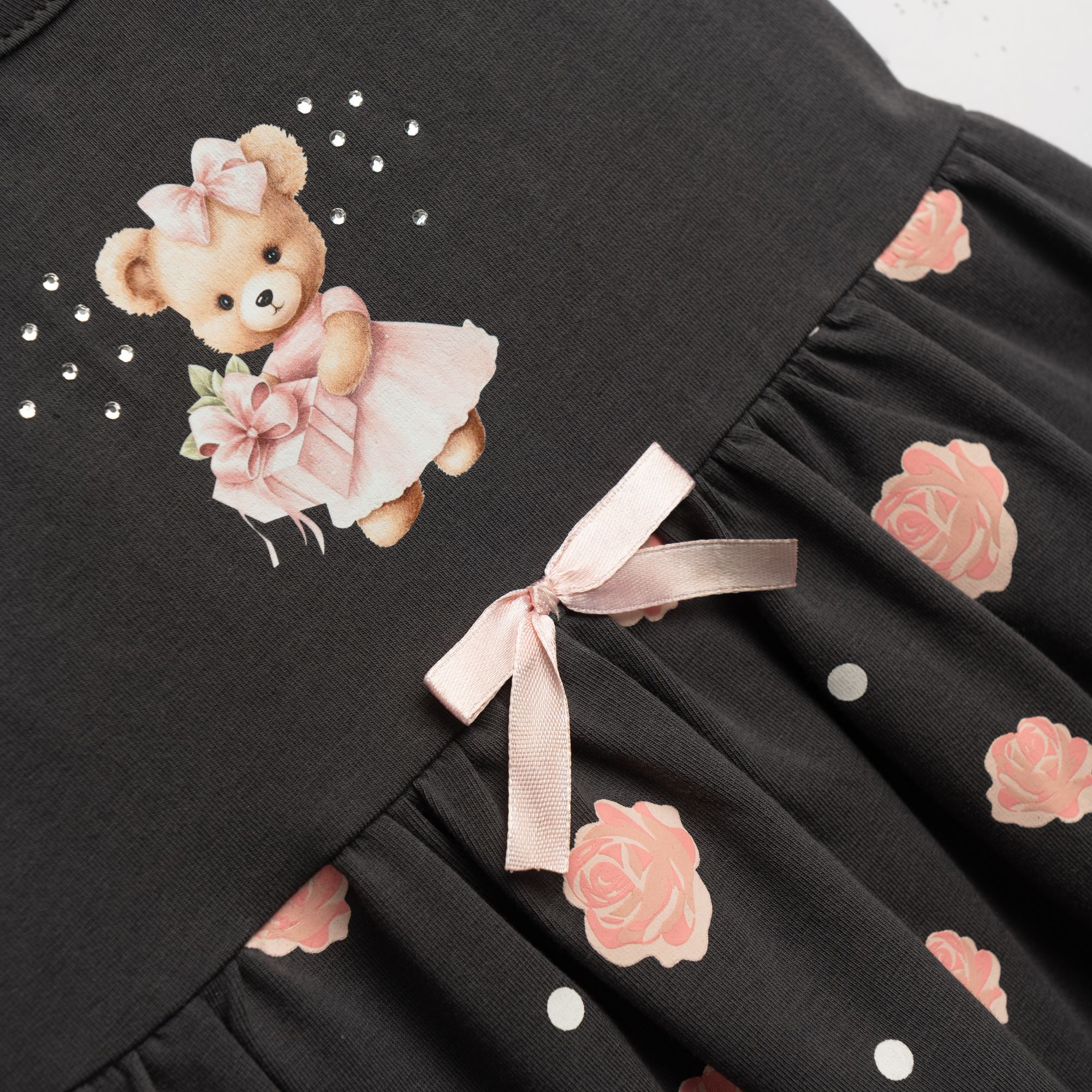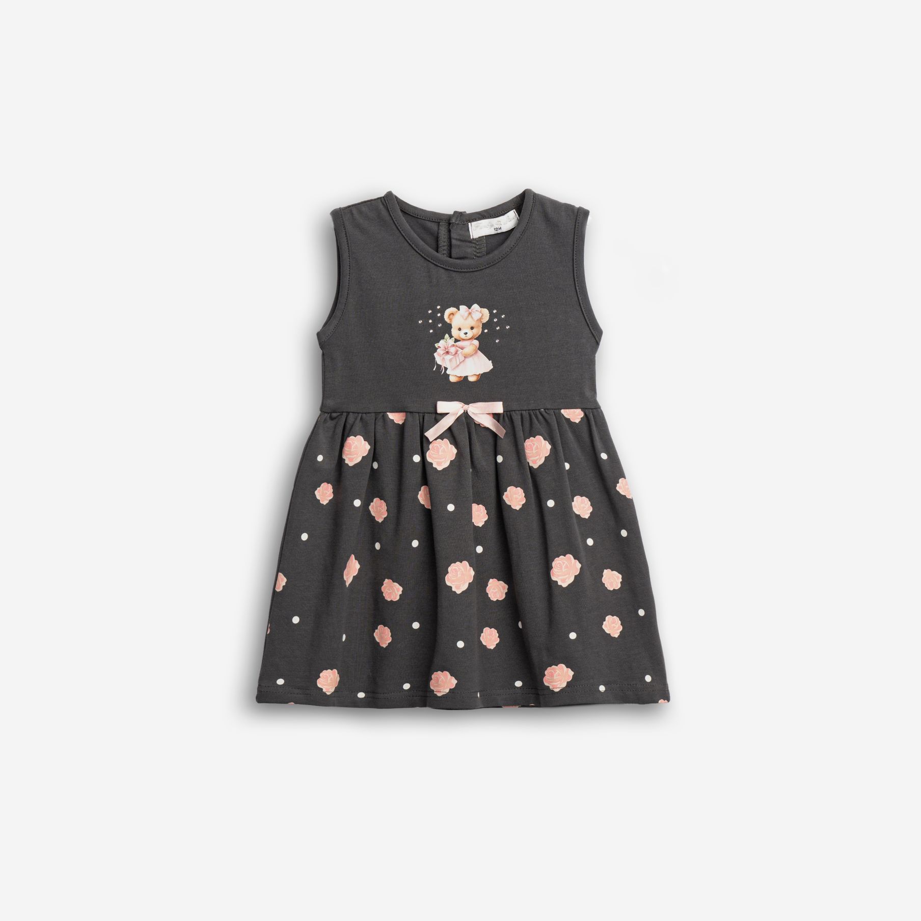 Φόρεμα κάλτσα λύκρα με τύπωμα (αρκουδάκι με λουλούδια) allover και κορδέλα σε χρώμα ανθρακί για κορίτσι μηνών